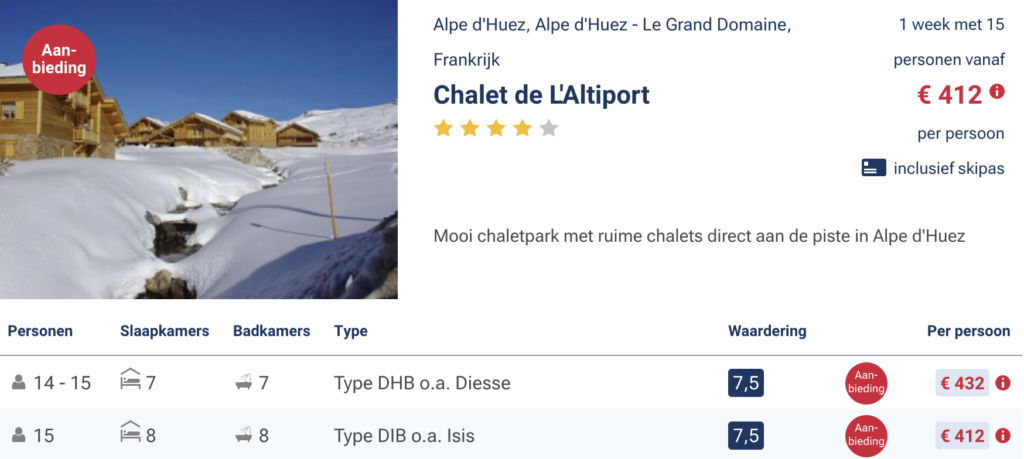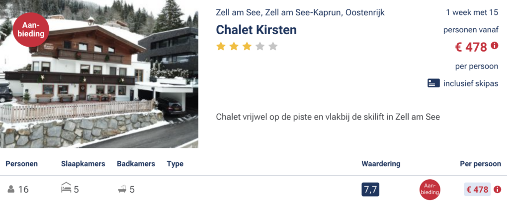Liever verblijven in een eigen vakantiewoning? De chalets van Chalet.nl zijn ideaal voor een wintersport met de hele familie of een groep vrienden. Ze zijn stijlvol, knus en van alle gemakken voorzien. En extra leuk: je kunt ze nu boeken tegen relatief gunstige prijzen! Neem snel een kijkje voordat het aanbod slinkt. Bekijk de onderstaande aanbiedingen voor maximaal 15 personen.