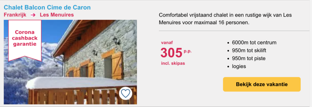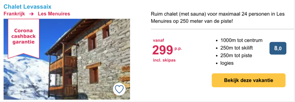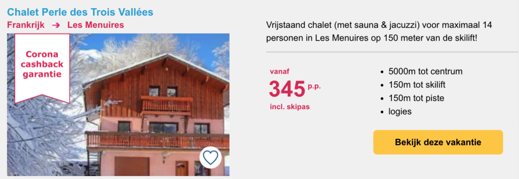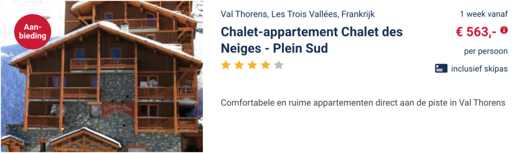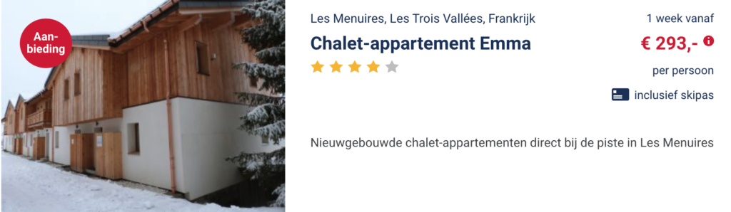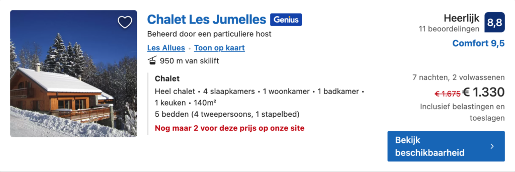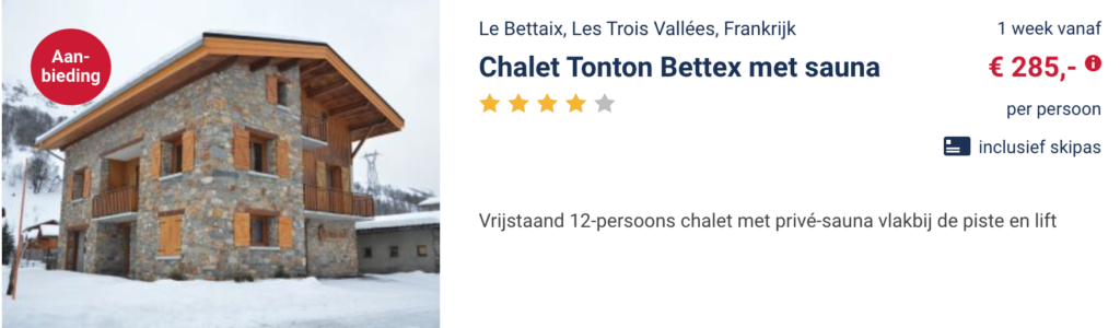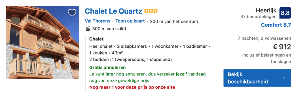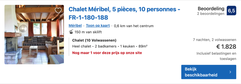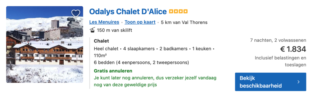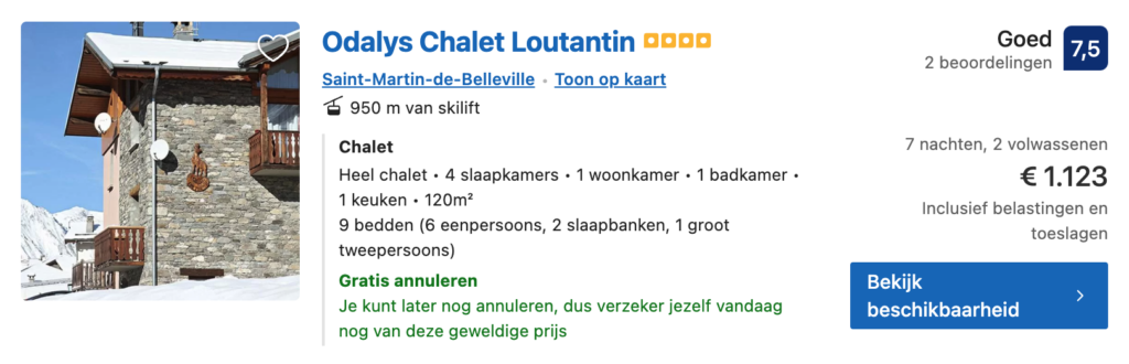 Ook bij Booking.com is er nog veel keuze aan chalets in Les 3 Vallées. Op dit platform kun je nog verblijfsmogelijkheden vinden in elk dorp in de skiregio. In alle soorten en maten, maar ook prijzen!