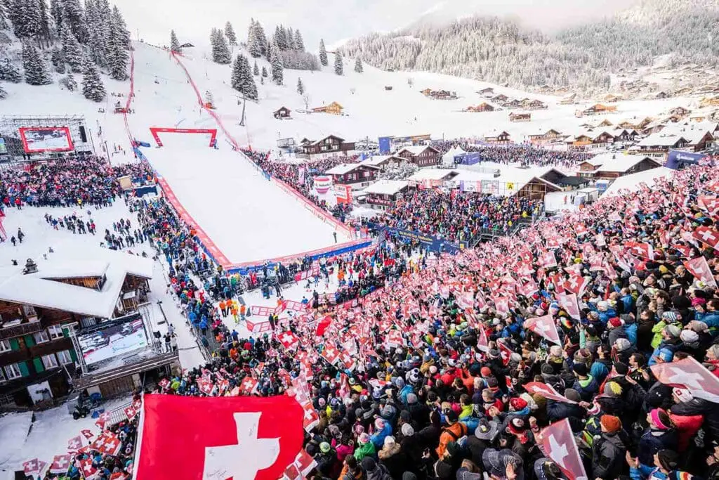 Een van de redenen, of misschien wel de voornaamste reden, waarom de World Cup in Adelboden zo spectaculair is, is vanwege de finish. Het einde van de wedstrijdpiste is namelijk de steilste en moeilijkste van het hele World Cup seizoen. Zodra de skiërs voorbij de ‘Chäla’ zijn, een bepaalde sectie van het parcours, storten ze zich in de ‘Giisbrunni’, het laatste stuk voor de finish. De laatste poort van de slalom staat op een stuk piste met een hellingspercentage van 60% waarna al snel de finishlijn volgt. Daar skiën ze zo richting de jubelende menigte fans die skiër na skiër toejuichen. Zelfs voor de meest ervaren wedstrijdskiërs is en blijft dit een spannende wedstrijd.