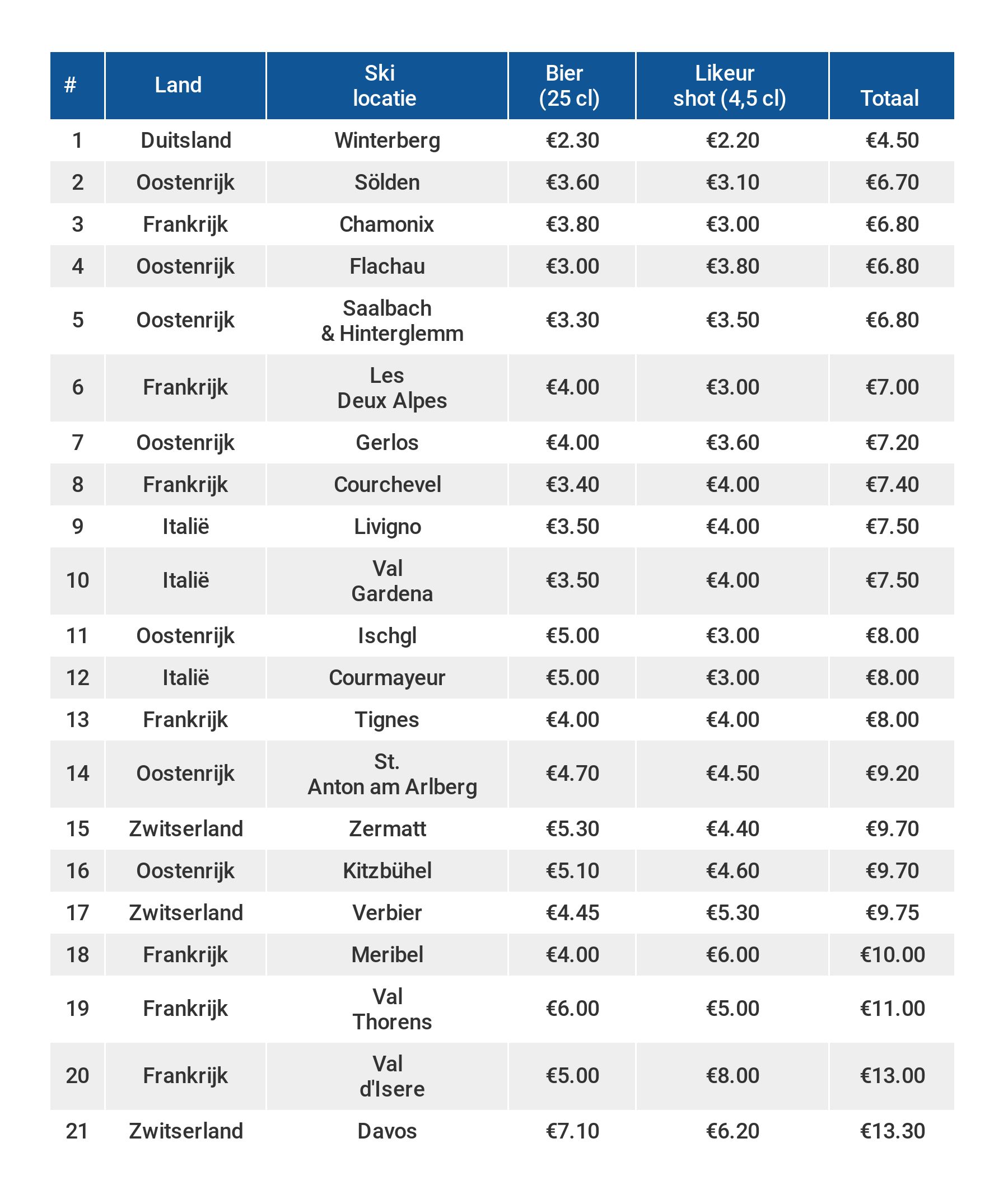 DataHomeToGo heeft deze ranglijst gebaseerd om de gemiddelde prijzen van een glas bier (0,25cl) en een shot likeur (4,5cl). Hiervoor hebben ze per bestemming de prijzen van drie verschillende locaties verzameld. De prijzen in de tabel hierboven zijn slechts een indicatie. Deze zijn in december 2018 verzameld en kunnen veranderd zijn, omdat sommige gebieden seizoensgebonden prijzen hanteren. Opgemerkt moet worden dat het slechts een beperkt onderzoek is geweest met een select aantal wintersportbestemmingen en après-ski barren. Als je een blik werpt op andere bars in een skigebied kun je hele andere uitkomsten krijgen.