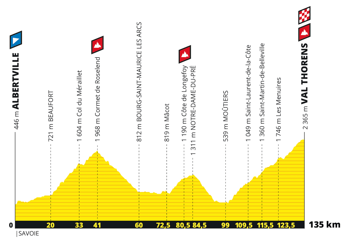 Vanuit Albertville rijden de wielrenners over onbekend maar erg lastig parcours. Na het doorkruisen van de Beaufortin-vallei beklimmen ze de spectaculaire Cormet de Roselend, voordat ze beginnen aan de de 34 kilometer lange beklimming vanuit de Belleville-vallei via de route en balcon de Saint Laurent de la Côte. Daarmee is die beklimming liefst 19 kilometer langer dan die naar Alpe d’Huez. Via het dorp Saint Martin de Belleville en Les Menuires komen ze aan in Val Thorens, aan de Chalets du Thorens op 2.365 meter hoogte. Goed voor een 131 kilometer lange etappe met 4.000 hoogtemeters.