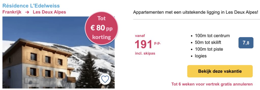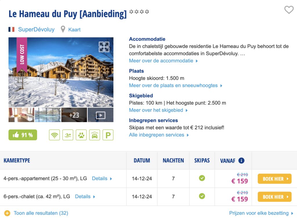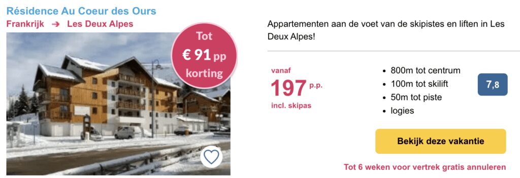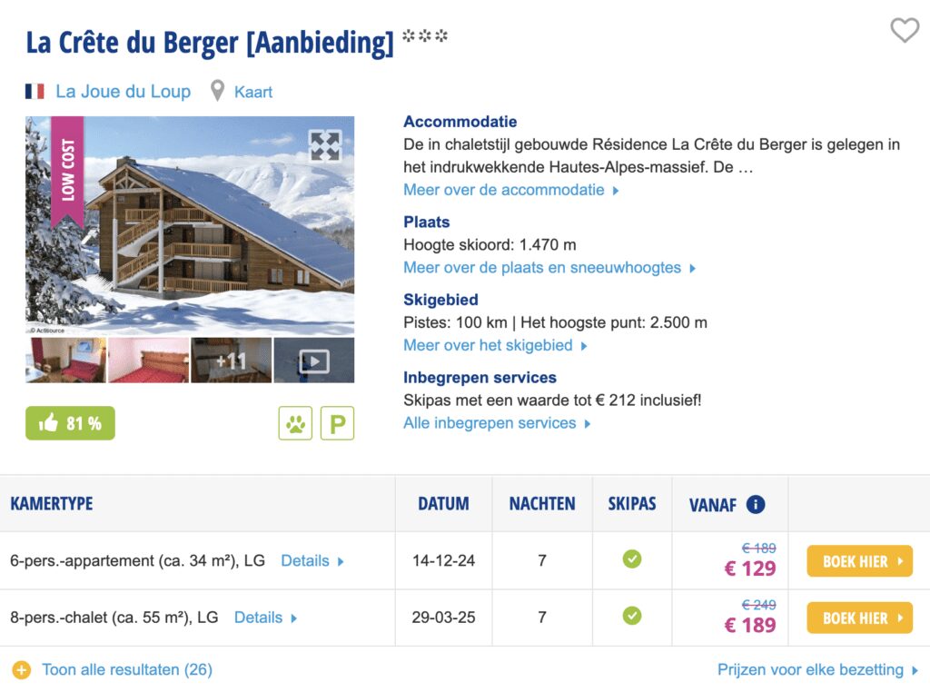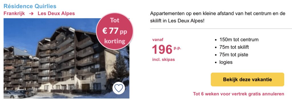 Deze reisaanbieder heeft een breed scala aan accommodaties voor het seizoen 2024/2025. Populaire bestemmingen zoals Les 2 Alpes bieden scherpe prijzen voor een geweldige wintersportervaring. Kijk snel op de website voor de nieuwste aanbiedingen onder de € 200,- per persoon: