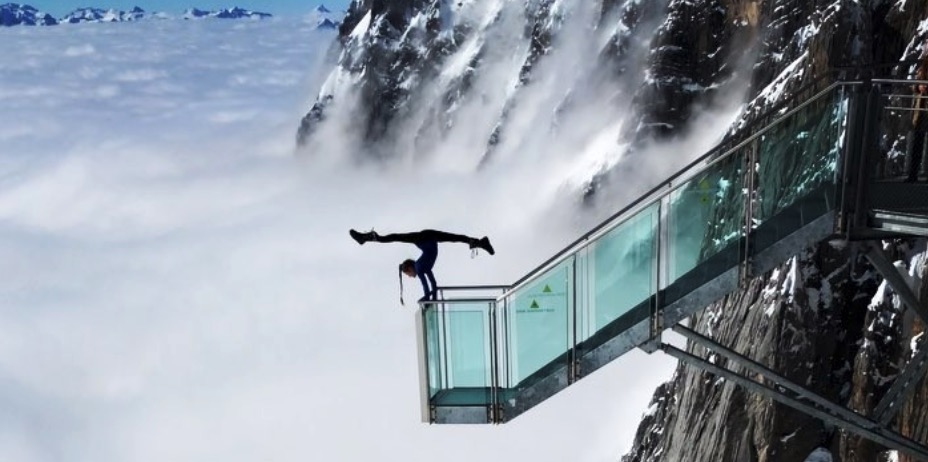Het betreden van de ”trap naar niets” op de Dachstein gletsjer in Schladming-Dachstein is al een adrenaline verhogende attractie opzich, maar voor deze vrouwelijke turnster kan het adrenalinegehalte niet hoog zijn. Zij maakt een handstand op de reling van het plateau.
