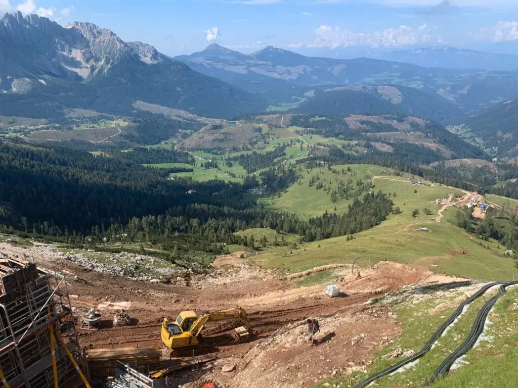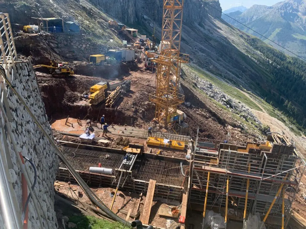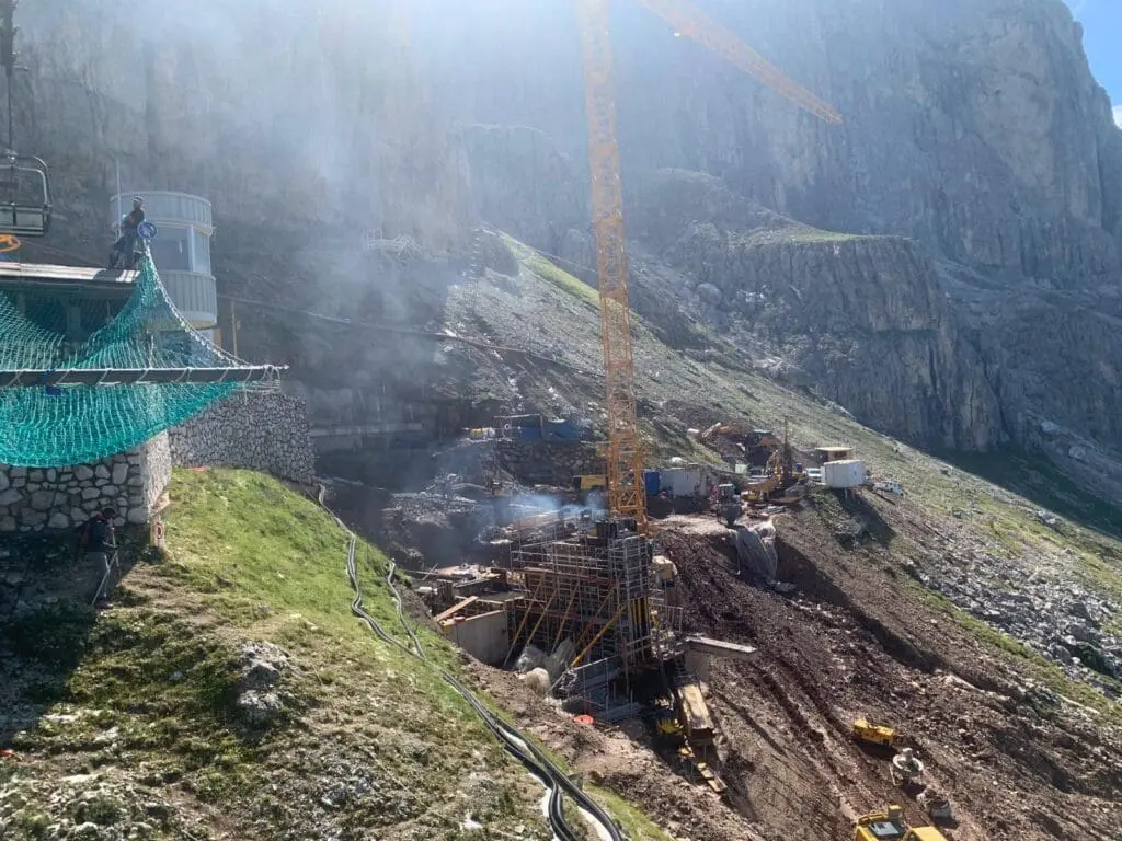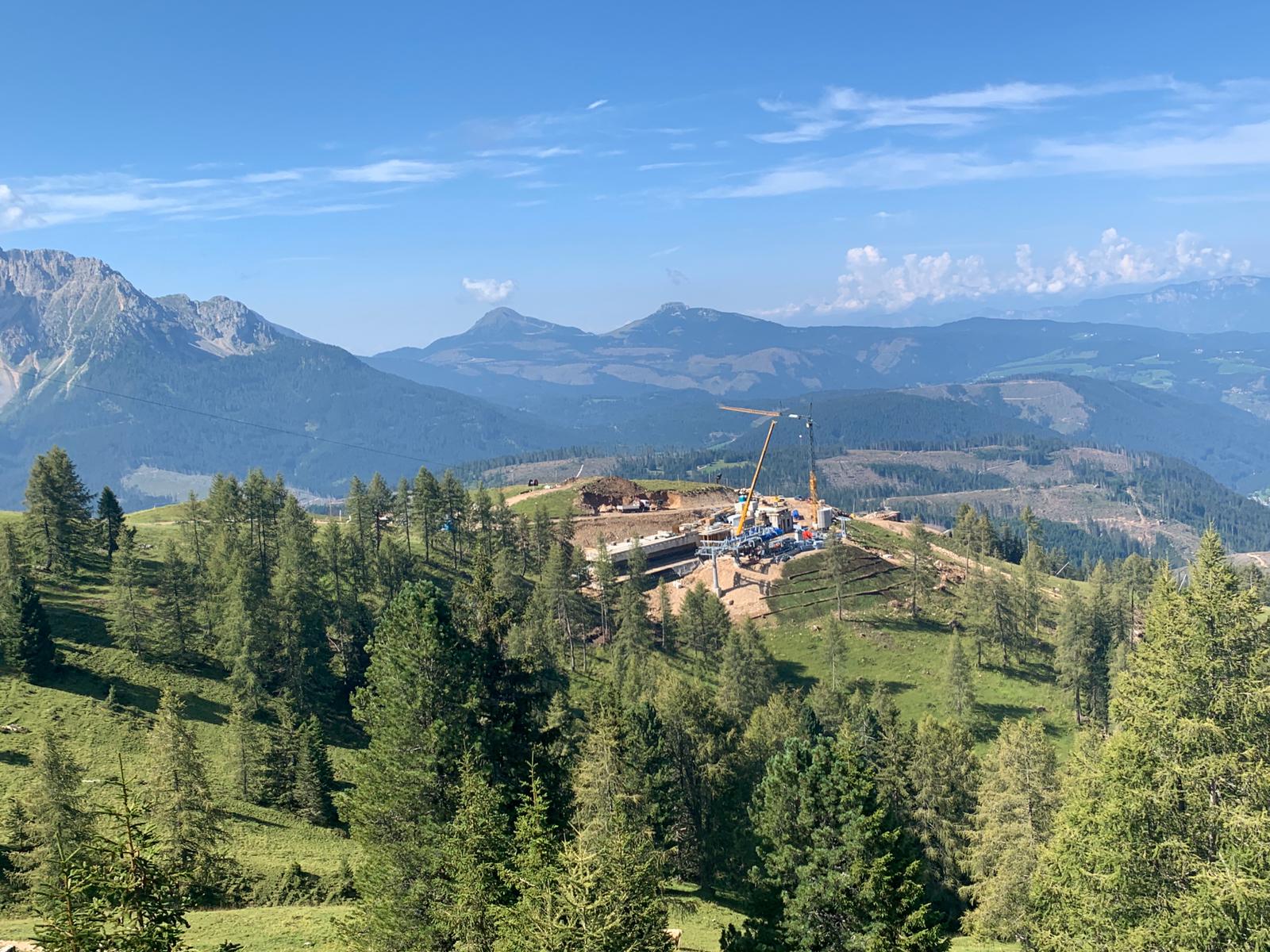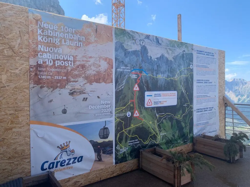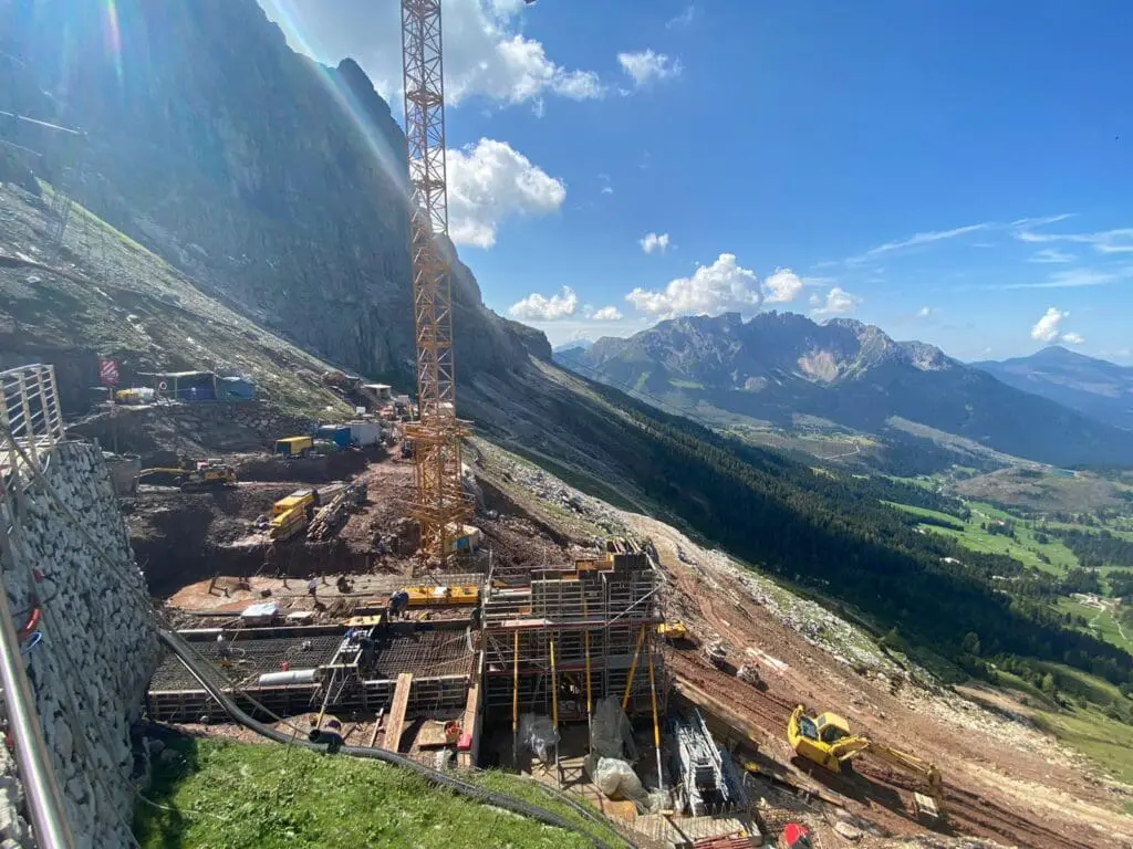 Om het uitzicht op het Rosengartenmassief te behouden, is het bergstation van de lift zo ontworpen dat het in de berg opgaat. Alleen de in- en uitgang voor de gondels en de toegangstunnel voor passagiers zou je nog moeten zien als de bouw van het station klaar is. Een mooie oplossing als je het ons vraagt. We zijn benieuwd hoe het er daadwerkelijk uit komt te zien. Je ziet nu al dat het bergstation echt in de berg wordt gebouwd in plaats van erop.