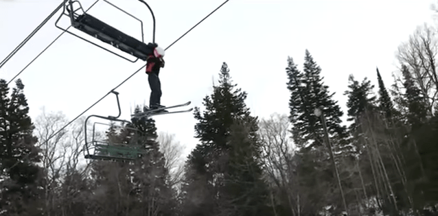 Snowboardster maakt fout in sleeplift en wordt gelanceerd