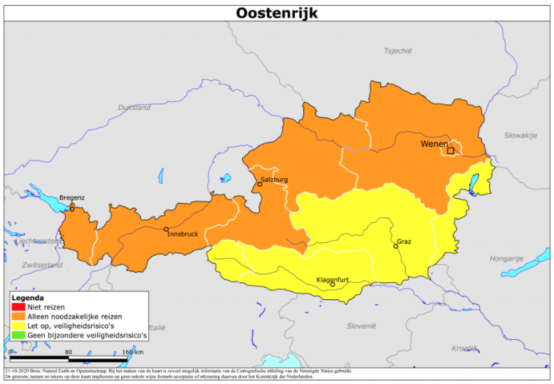 Nog niet heel Oostenrijk staat op oranje. De deelstaten Steiermark, Karinthië en Burgerland staan op dit moment nog op geel. Dit geldt ook voor Osttirol, de Tiroolse gemeenten Hinterriß en Jungholz en het Kleinwalsertal in Vorarlberg.