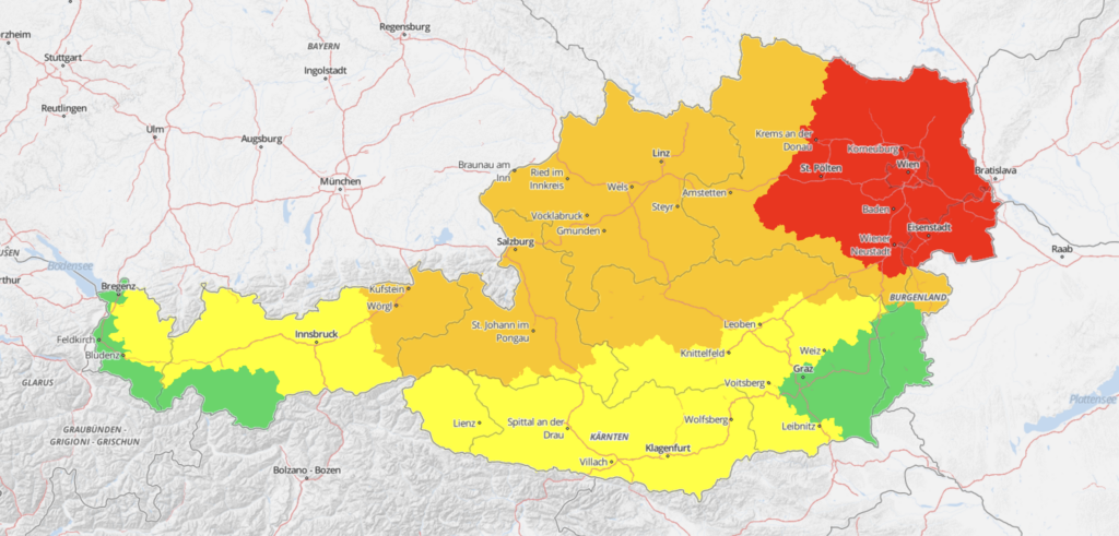 Code geel en oranje zijn in delen van Oostenrijk omgeslagen naar rood. Deze rode weerwaarschuwing geldt voor het oosten van Oostenrijk. Er wordt gewaarschuwd voor overstromingen, stormen en sneeuwval, vooral in Obersteiermark.