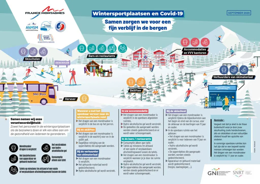 • Mond- en neusbescherming is verplicht voor iedereen vanaf 11 jaar. Onder andere in skiliften, skibussen en liftstations, in alle gesloten openbare ruimtes, in restaurants (behalve aan tafel) en bij bushaltes.