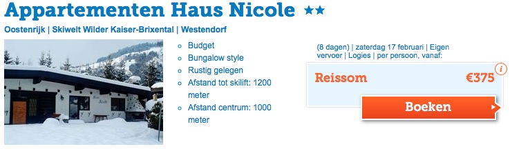 Haus Nicole ziet eruit als een bungalow en is rustig gelegen. Dit geeft je dan ook al gelijk een heerlijk vakantiegevoel. Op slechts 1 kilometer afstand zijn de pistes van Skiwelt Wilder Kaiser-Brixental te vinden. Daar is voor ieder wat wils. De kinderen kunnen er prima uit de voeten en ook de beginnende en de gevorderde skiër komen hier niks tekort. Wanneer er voldoende sneeuw ligt is het zelfs mogelijk om naar 8 skidorpen te skiën. Boek dit appartement hier voor €375,- per persoon.