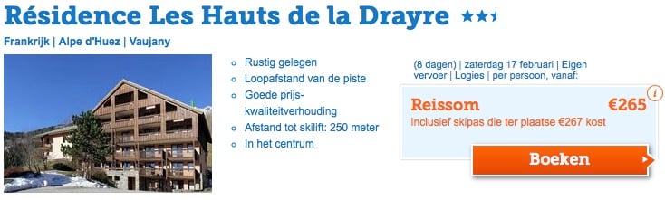 Résidence Les Hauts de la Drayre is gelegen op 250 meter van het skigebied Alpe d’Huez, wat we in Nederland vooral kennen van het wielrennen. Toch kun je in dit skigebied prachtig skiën en behoort het skigebied tot een van de grootste skigebieden van Frankrijk. Vooral de gevorderde skiër zal zich in dit gebied helemaal op zijn plek voelen. Je boekt deze accommodatie al last minute voor €265,- per persoon.