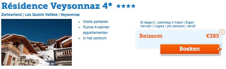 Résidence Veysonnaz 4 zijn prachtig gelegen appartementen. Doordat de skibus er voor de deur stopt sta je elke dag snel op de pistes van Les Quatre Vallées. Hier vind je meer dan 400 kilometer aan piste waar ieder skiër voldoende uitdaging vindt. Je boekt deze accommodatie hier voor €385,- per persoon.