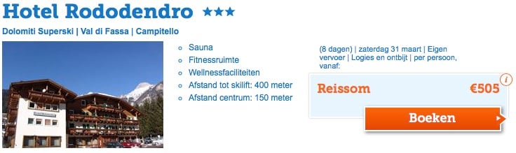 Hotel Rododendro is een rustig hotel wat erg centraal gelegen is. Zowel de piste als het centrum zijn namelijk om de hoek. Het Skigebied Dolomiti Superski is erg groot en zorgt ervoor dat er voor iedereen een uitdaging te vinden is. Zo kunnen beginnende skiërs rustig oefenen op de eenvoudige pistes, terwijl de diehard van de zwarte piste af kan razen. Je boekt deze last minute hier voor €505,- per persoon.