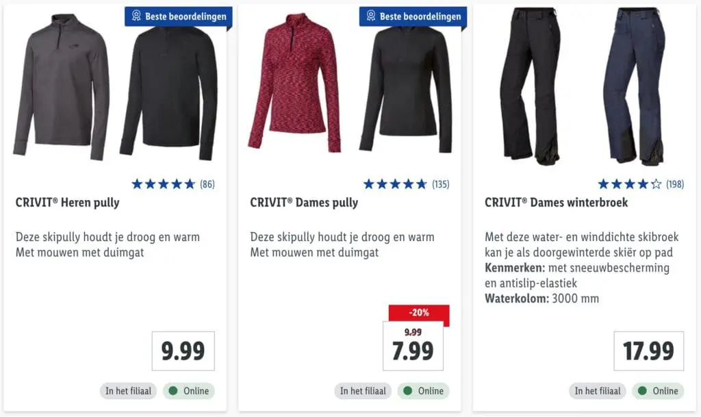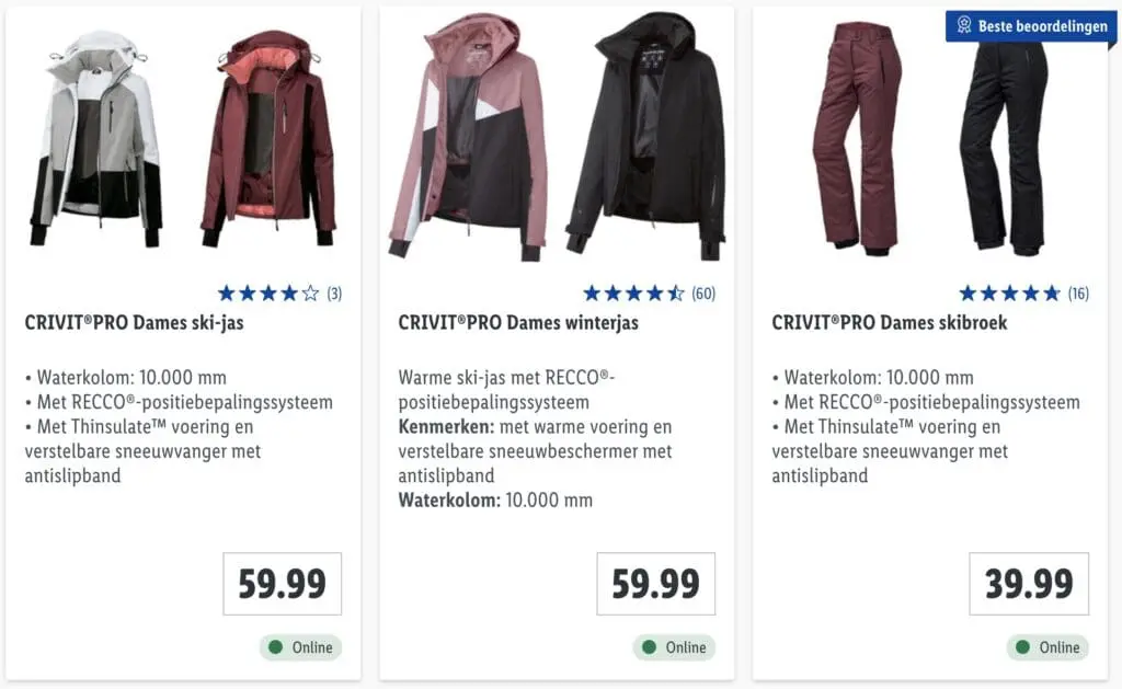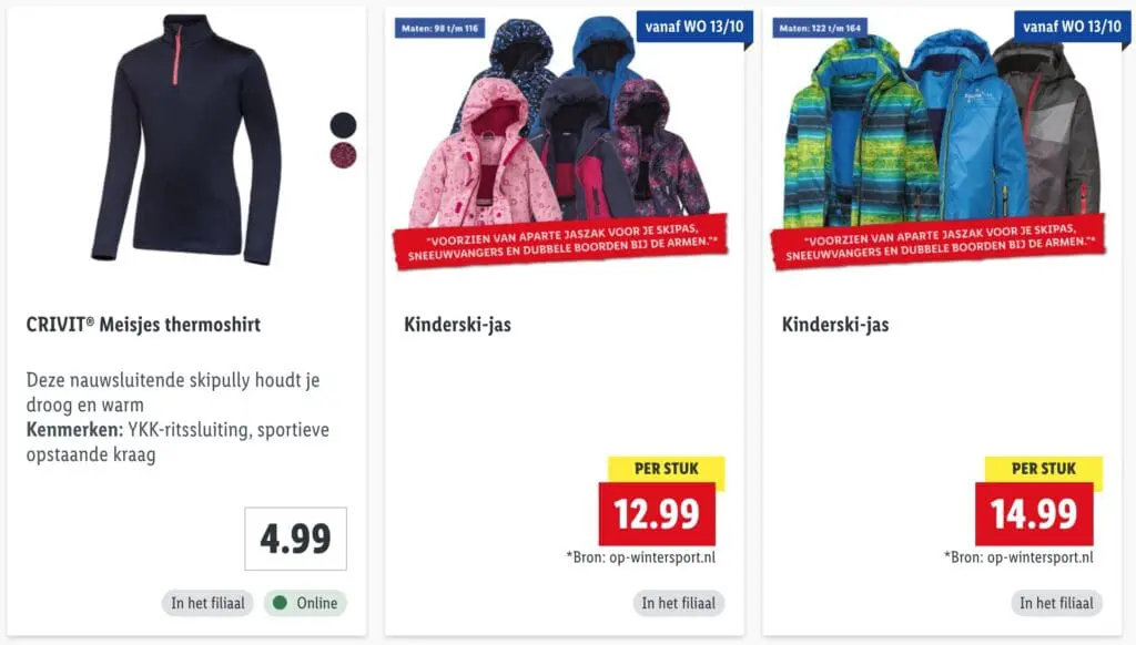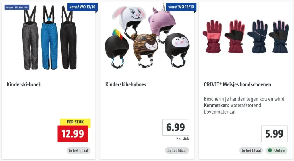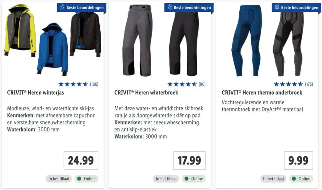 De nieuwe wintersportcollectie van Lidl betekent betaalbare skikleding voor iedereen. Het assortiment is breed en verkrijgbaar in vele kleuren, dus voor ieder wat wils! De supermarktketen verkoopt thermo-kleding, ski-jassen, helmen, skibrillen, skisokken, handschoenen en nog meer. De producten zijn voor jongens, meisjes, mannen en vrouwen. Op deze manier kan het wat betaalbaarder worden voor iedereen! Hieronder hebben we een aantal van de beste producten voor je op een rijtje gezet. Klik op de afbeelding voor meer wintersportkleding van de Lidl.