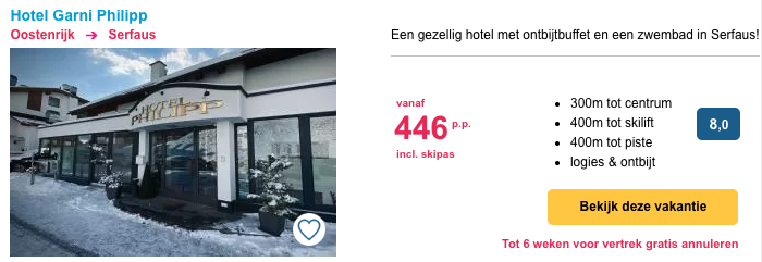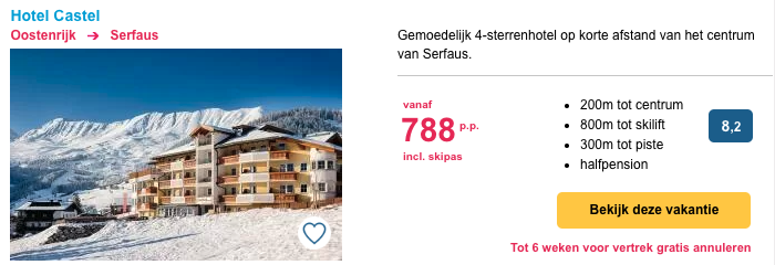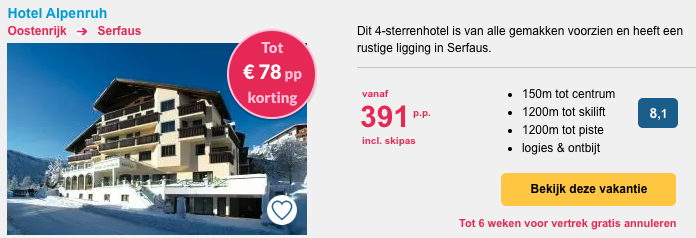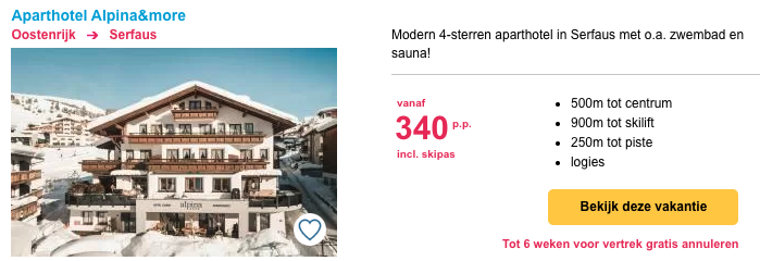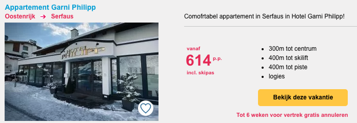 Goed nieuws! Bij Summit Travel kun je verblijven in verschillende accomodaties in Serfaus-Fiss-Ladis vanaf €340,- per persoon, inclusief een skipas voor het skigebied. Je hoeft je bij aankomst dus geen zorgen meer te maken over de aanschaf van je skipas. Deze prijzen zijn dus echt heel aantrekkelijk! Daarnaast leg je de prijs van je skipas meteen vast en kan deze dus niet meer omhoog in aanloop naar de winter.