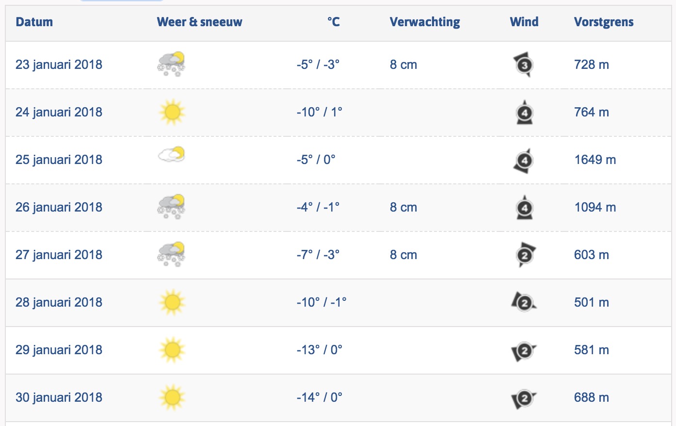 Morgen en overmorgen wordt het overwegend zonnig in de Alpen. Wat we daarna kunnen verwachten is nog niet helemaal zeker. Het ene weerportal heeft het over regen/sneeuw op vrijdag en zaterdag, terwijl het andere praat over zon. We wachten het rustig af. Morgen lunchen we in ieder geval buiten! Hieronder de voorspelling voor Kitzbühel, waar vandaag het Double Dutch Ski & Music Festival van start is gegaan!