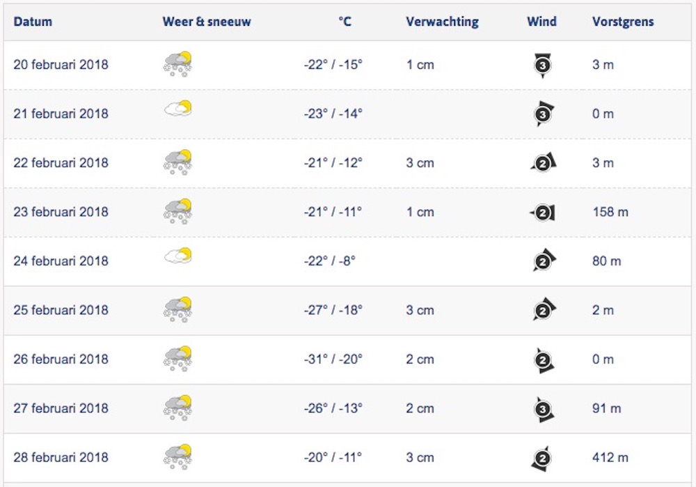 Hieronder zie je de weersvoorspelling voor Sölden voor de langere termijn. En ja, er staat echt -31˚C tussen, dat is geen foutje.