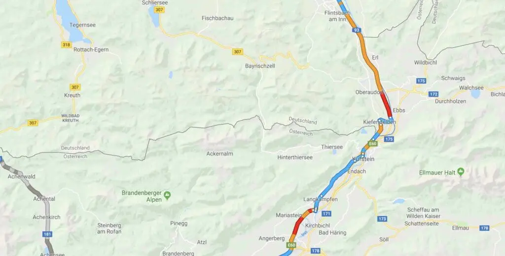Bij de grenscontrole in Kufstein zijn de wachttijden nu al flink opgelopen. Op de Inntal Autobahn bij de uitrit van de verschillende dalen is het ook druk. Zoals je bij de onderstaande Google Maps afbeelding kunt zien is het vooral na Kufstein raak.