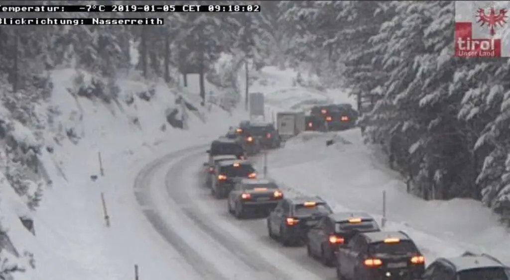 Wie de Fernpass neemt vandaag moet rekening houden met lange wachttijden. Daar staat nu al een flinke file en op de onderstaande webcam foto van Tirol is goed te zien dat je netjes achter in de rij kunt aansluiten. Ook de weg is hier nog voorzien van een verse laag met sneeuw, waardoor op sommige plekken de sneeuwkettingen omgedaan worden.
