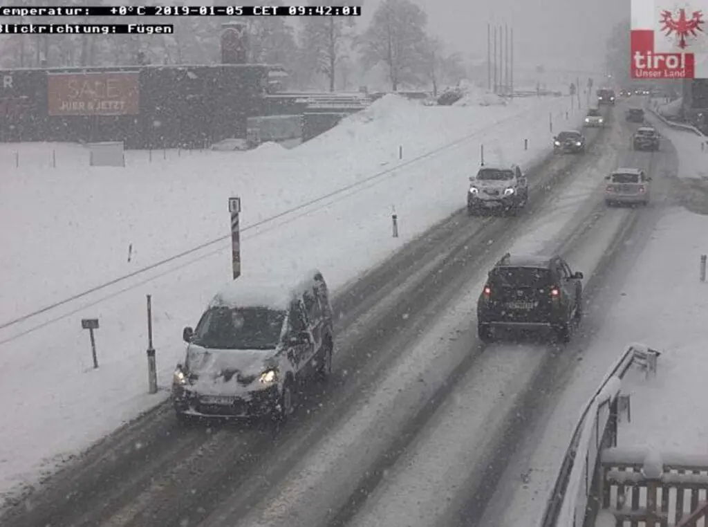 Uiteraard stromen op dit moment de dalen vol met alle wintersporters die vanuit de skigebieden vertrekken. De wegen zijn wit en iedereen kan netjes in de rij aansluiten. Zie hieronder bijvoorbeeld de situatie in het Zillertal. Witte wegen en een lange slinger met rijdende auto’s!