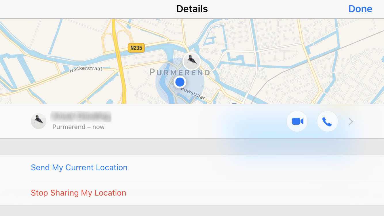 Een andere optie, die voor de iPhone werkt, is het automatisch delen van je locatie met iemand anders die een iPhone heeft. Je vindt die mogelijkheid in de berichten app van iOS. Ga naar je gesprek toe met diegene, druk op het ‘info knopje’ en je ziet de mogelijkheid verschijnen. Je kunt daar tijdelijk je locatie delen, maar ook voor eeuwig. Zo kun je altijd zien waar bijvoorbeeld je vriend/vriendin/man/vrouw/kind is. Let op, dit kan tot ruzies leiden ;-).