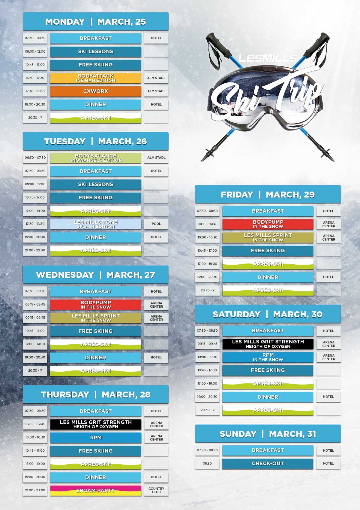Je dag ziet er iedere dag weer anders uit. Je begint met een stevig ontbijt. Verder ga je skiën en doe je mee met verschillende sportevenementen. Natuurlijk is er ook tijd ingepland voor de après-ski! Benieuwd naar de workouts? Zie hier het volledige programma.