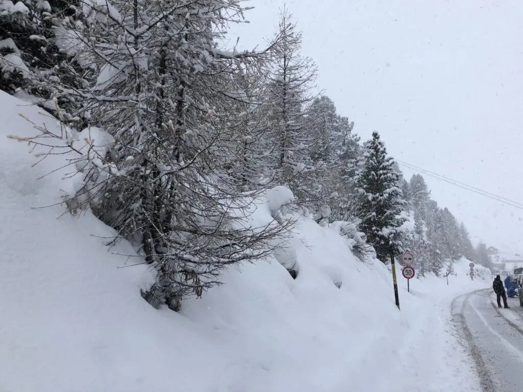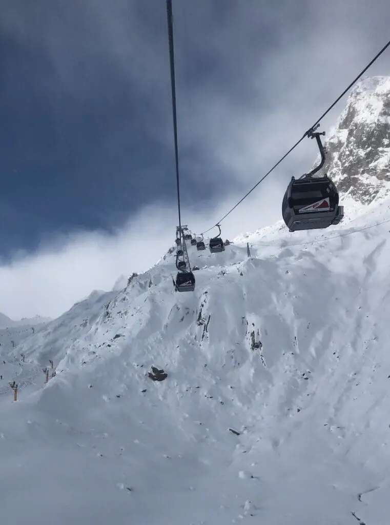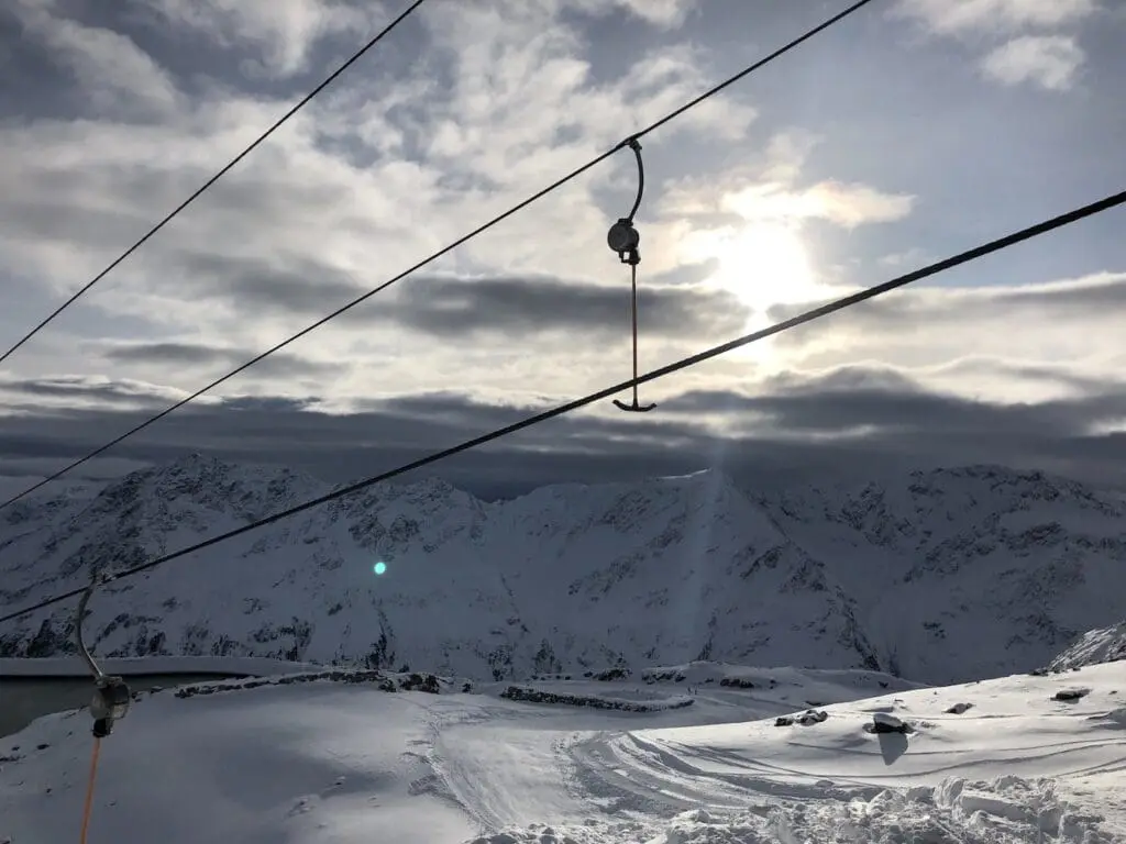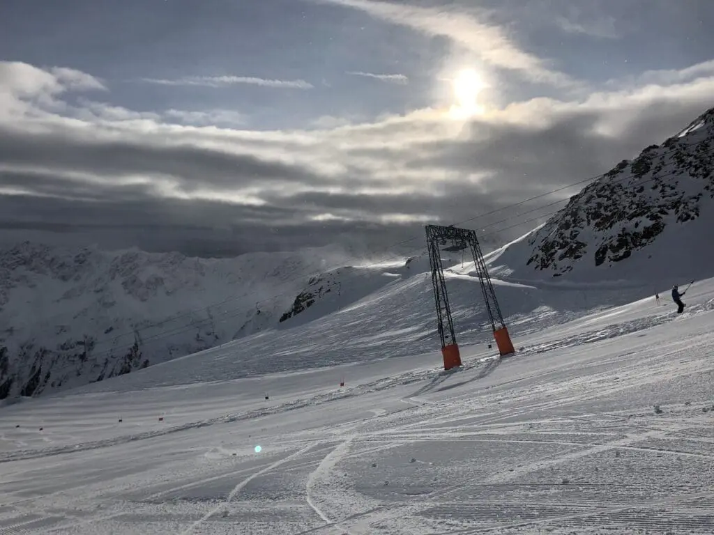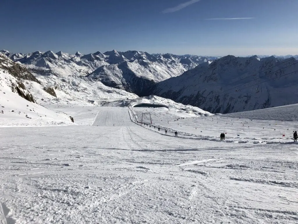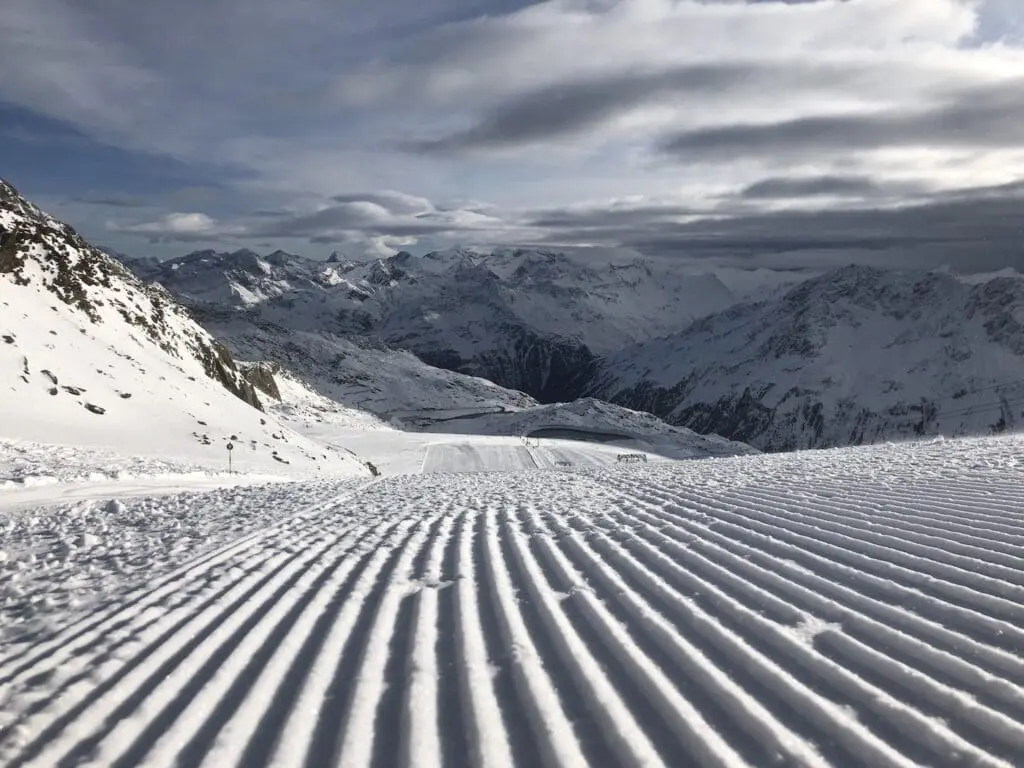 Dinsdag startte met verse sneeuw in het dal. Ik deed de gordijnen open en werd getrakteerd op een wit Sölden. Er lag zo’n 10 cm in het dorp, waardoor het er heerlijk winters uitzag. We konden helaas pas wat later naar boven, omdat de Gletscherweg nog schoongemaakt moest worden. Met sneeuwkettingen om kwamen we uiteindelijk veilig boven, maar het was nog even spannend.