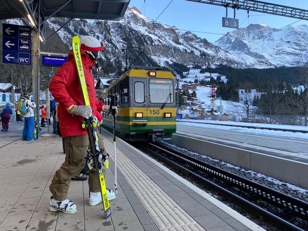 Na het treinritje naar beneden en een lunch bij het Kleine Scheidegg bergrestaurant in het station was het wel eens tijd om de pistes te verkennen. Daarvoor stapten we direct in de ski’s, want het treinstation ligt midden in het skigebied. Uiteraard wilden we de Lauberhorn afdaling af, waar afgelopen weekend de World Cup werd geskied. De wedstrijdskiërs knallen de langste afdaling van het circuit met 155 km/u naar beneden, wij deden het iets rustiger aan.