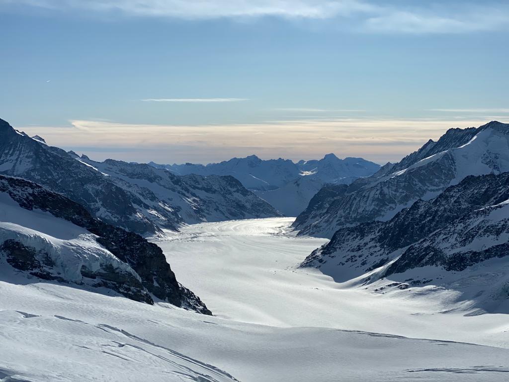 Voordat we vandaag de latten onder klikten, bezochten we het hoogste treinstation van Europa. Dat is de Jungfraujoch op maar liefst 3.454 meter hoogte. Daar genoten we van het uitzicht op onder andere de Aletsch Gletscher, waar we deze zomer aan de overkant stonden. Wat een indrukwekkend punt. En wat bizar dat die trein zo hoog komt!