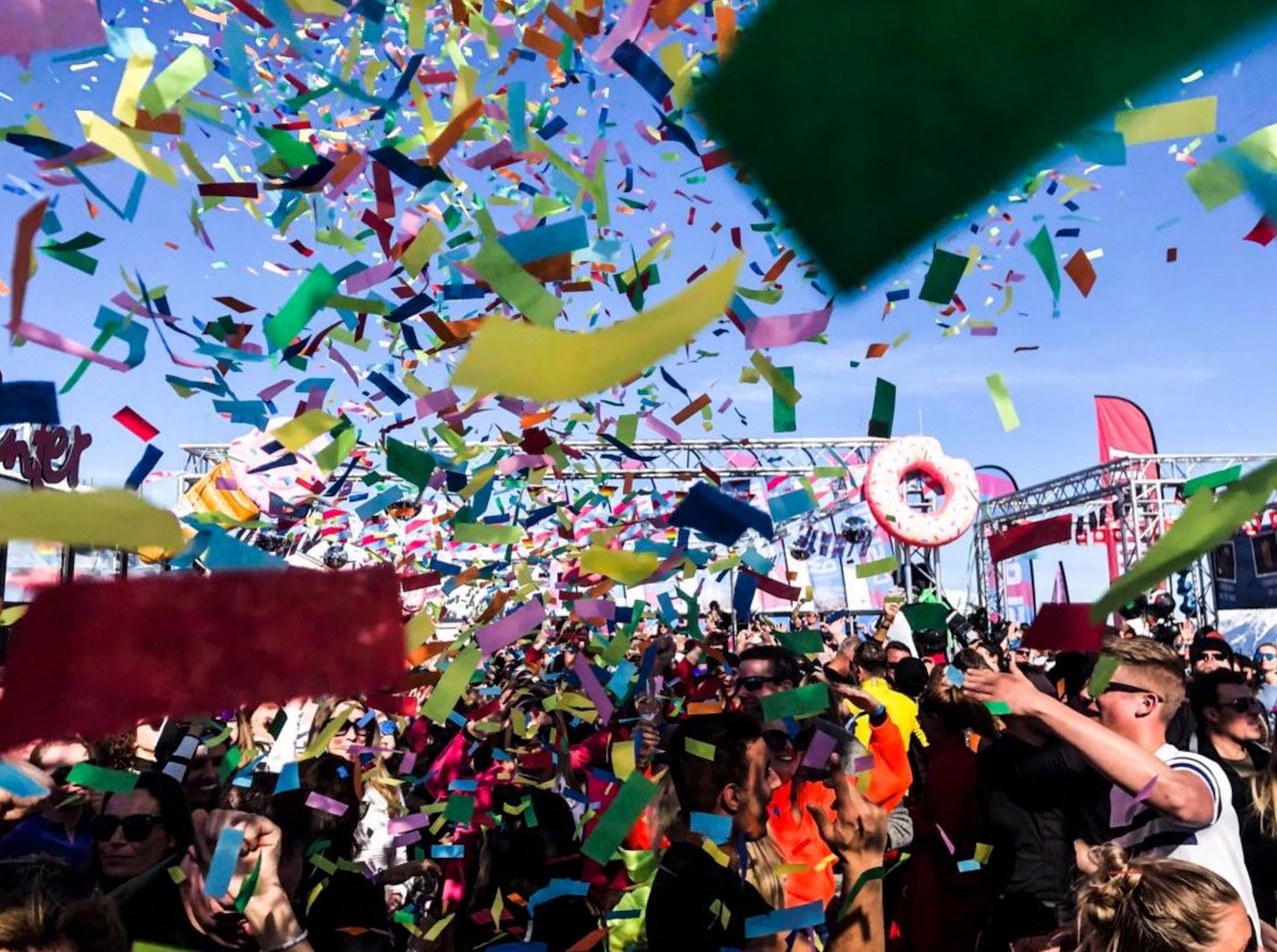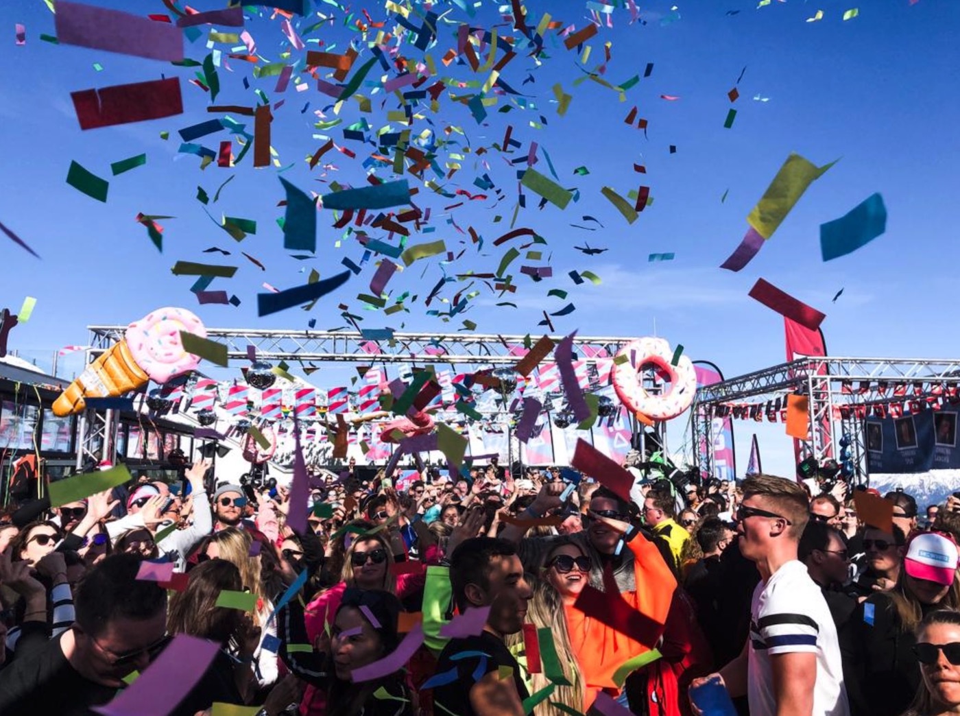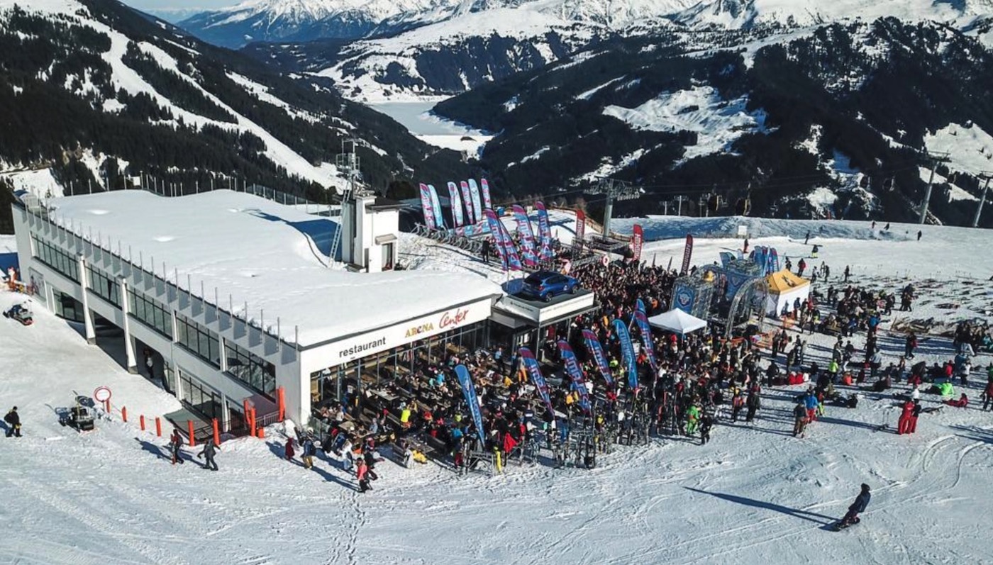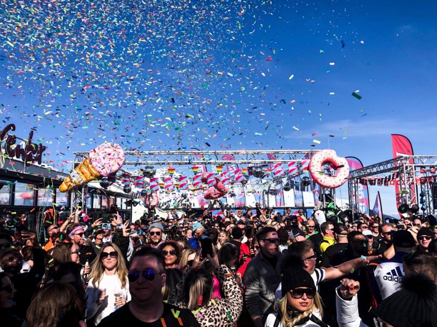 Frank, Joeri, Sebi, Jahna, Vera en Maurice zijn te vinden bij het Arena Center in Gerlos, bovenaan de Isskogelbahn. Daar is het al de hele middag gezellig en nu helemaal. La Fuente treedt daar nu op met zijn Full Colour Innercircle, wat betekent dat het een festijn van kleuren is door de confetti.