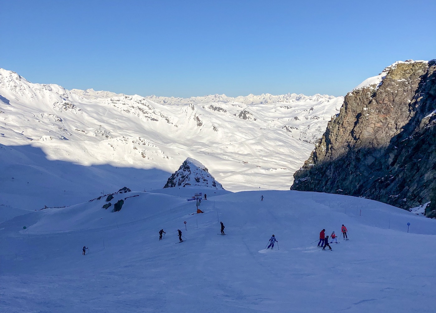 Aangezien de Dutchweek in Val Thorens eind april plaatsvindt, is het bijna altijd prachtig weer. Aangename temperaturen, een strakblauwe lucht en een heerlijk warm zonnetje zijn tijdens deze week meer regel dan uitzondering. Dit jaar was dat echter anders, want het was nog volop winter! Er lag nog meters sneeuw en de pistecondities waren nog perfect. Vorige week was er nog zo’n 20 cm verse sneeuw gevallen en ook deze week begon al met zo’n 5 cm verse sneeuw. De eerste twee dagen leek het wel midden januari met lage temperaturen en verse sneeuw. Gelukkig kwam daarna het zonnetje door en genoten we de rest van de week van heerlijk weer.