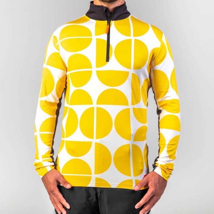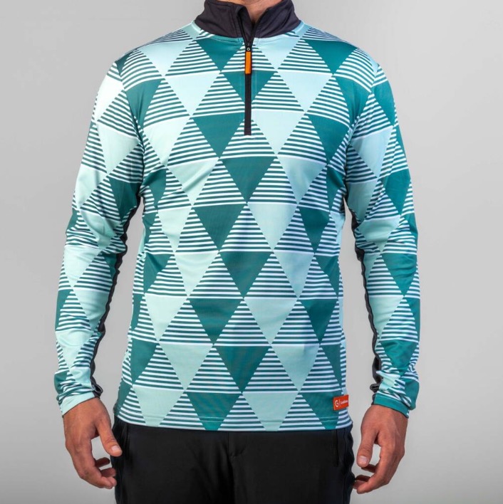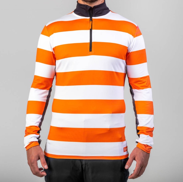 Elke Gareth & Lucas pully is te herkennen aan een aantal oranje elementen, zoals het lipje bij de rits en het merkje. “Daarmee laten we zien dat we trots zijn op onze Nederlandse afkomst. En we zijn ambitieus en willen een beetje lef tonen. Uiteindelijk willen we ook jassen, broeken, helmen en andere wintersportkleding gaan ontwerpen en leveren.” De pullies zijn in eerste instantie gemaakt voor de wintersporter, maar het is een multifunctioneel kledingstuk. Vanwege de prints en de stof vinden wij ze ook wel lijken op een fietsshirt.