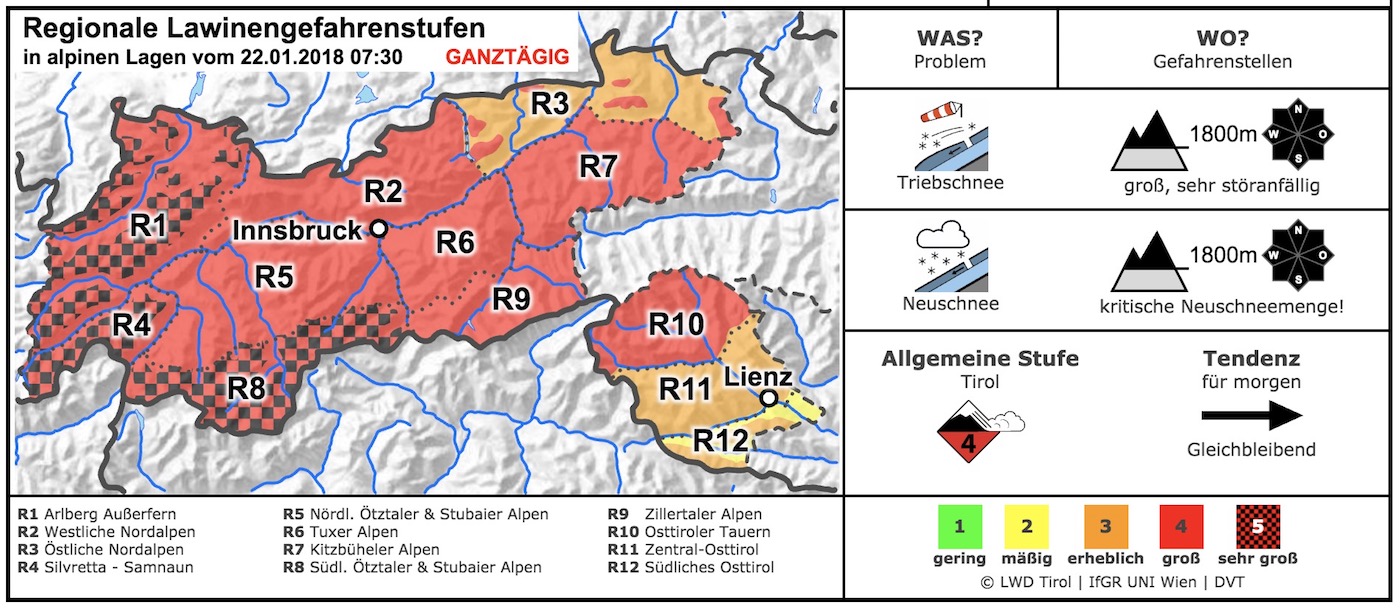 Binnen een dag viel er meer dan een meter sneeuw op veel plekken in Tirol. Dat ging gepaard met harde wind, waardoor het lawinegevaar zeer groot is. In heel Tirol is de kans op lawines groot. In het westen wordt zelfs het hoogste lawinegevaarniveau afgegeven. Je ziet het hieronder op de afbeelding uit het lawinebericht dat vanochtend is uitgegeven.