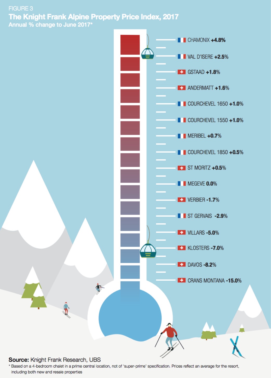 Niet overal is er sprake van dalingen van de prijzen. In sommige gebieden zijn de huizenprijzen aanzienlijk gestegen. De grootste prijsstijging ten opzichte van vorig jaar was te vinden in Chamonix. Hier stegen de prijzen namelijk met 4,8 procent! In Val d’Isère was er een stijging van 2,5 procent en alsof de huizen in Gstaad nog niet duur genoeg waren, stegen de prijzen nog met 1,8 procent.