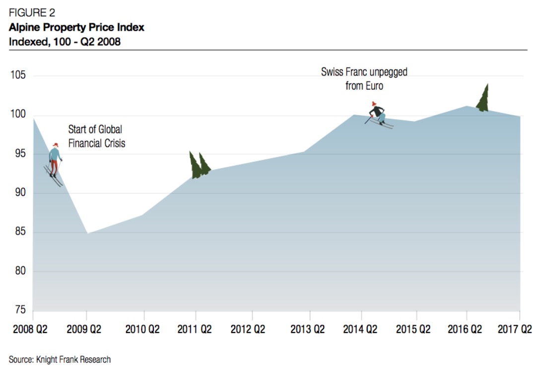 In de onderstaande afbeelding, de ‘Alpine Property Price Index’, is te zien hoe de huizenprijzen in de Alpen de afgelopen jaren zijn gestegen en gedaald. Na een flinke daling tijdens de financiële crisis zijn de prijzen al snel weer opgeklommen. Had je dus een huis willen kopen, dan had je eigenlijk iets eerder moeten zijn.