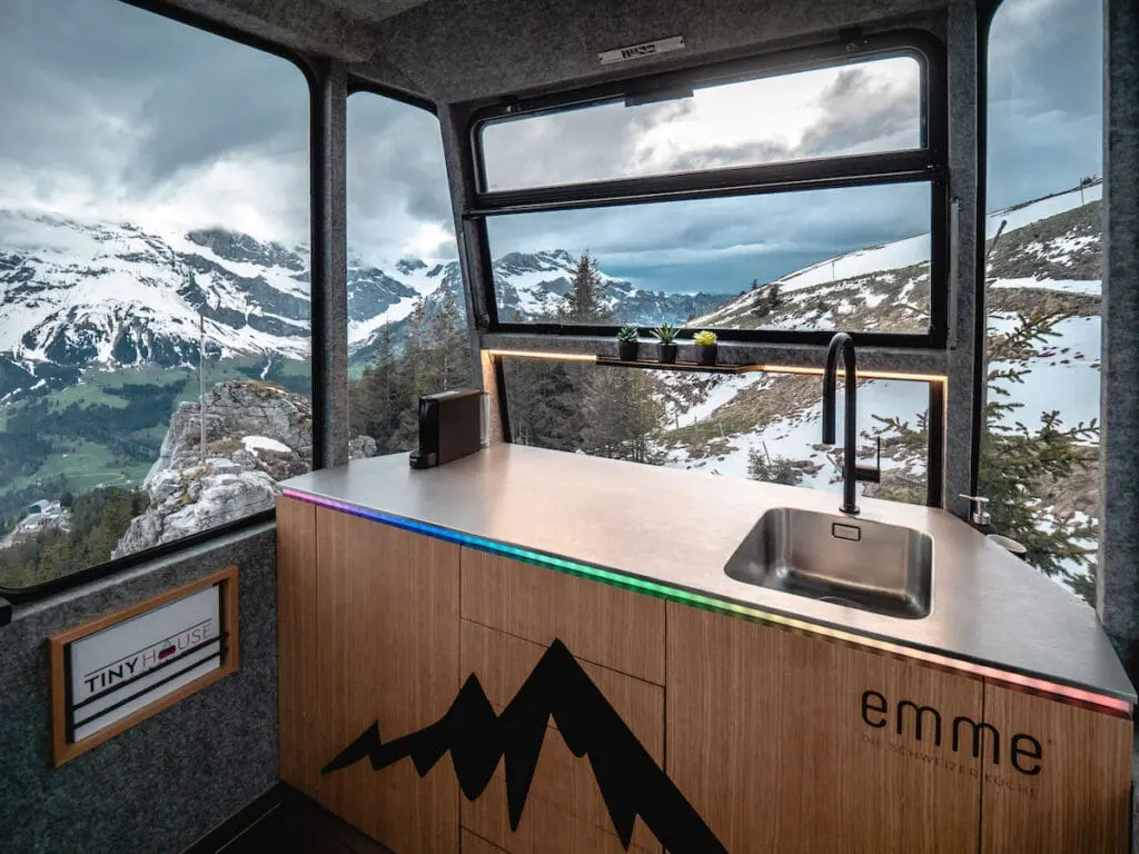 In de zomer van 2020 stond de gondel op de Piz Nair bij St. Moritz en nu is ze weer terug in het Brunni-gebied bij Engelberg. De hele zomer staat de gondel hier op een rotspunt op 1880 meter hoogte. De kleine ruimte is van alle luxe gemakken voorzien. Van een comfortabel tweepersoonsbed tot een kleine, maar moderne keuken die bediend kan worden met je vingerafdruk. Naast de gondel staat een klein biologisch toilet en douchen kan bij Berglodge Ristis. Van tevoren kun je een diner bestellen en dat wordt dan ’s avonds naar de gondel gebracht. ’s Ochtends staat er een goedgevulde ontbijtmand voor je klaar. Overnachten is niet goedkoop. Je betaalt tussen de 490 en 510 frank per nacht, wat neerkomt op ongeveer 460 euro. De tiny house gondel zal tot 31 oktober in het Brunni-gebied blijven staan. Boeken kan binnenkort hier.