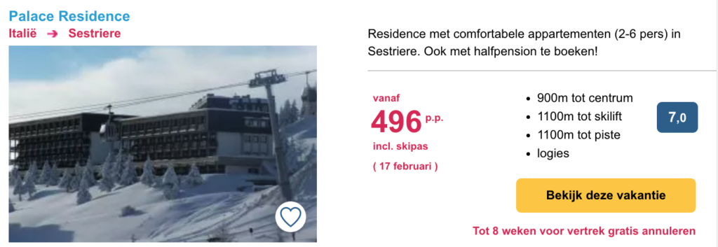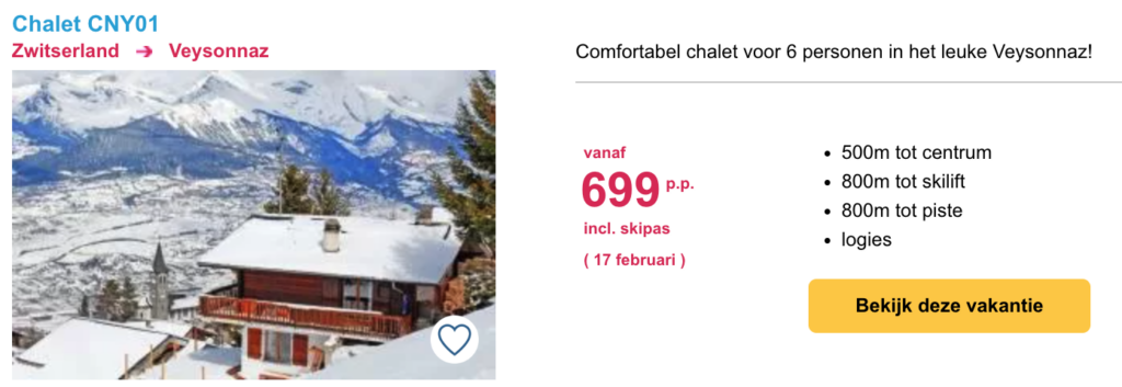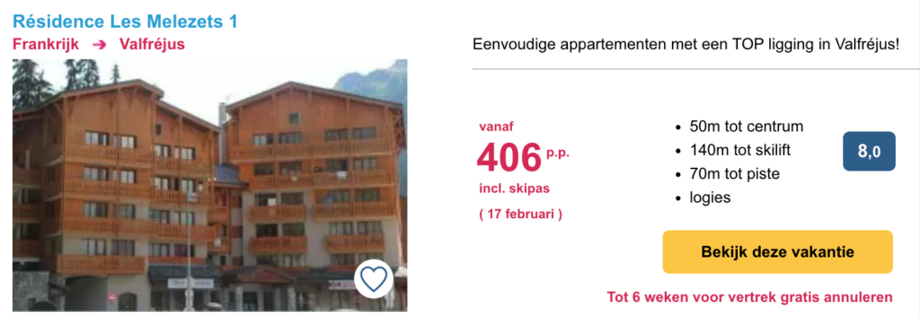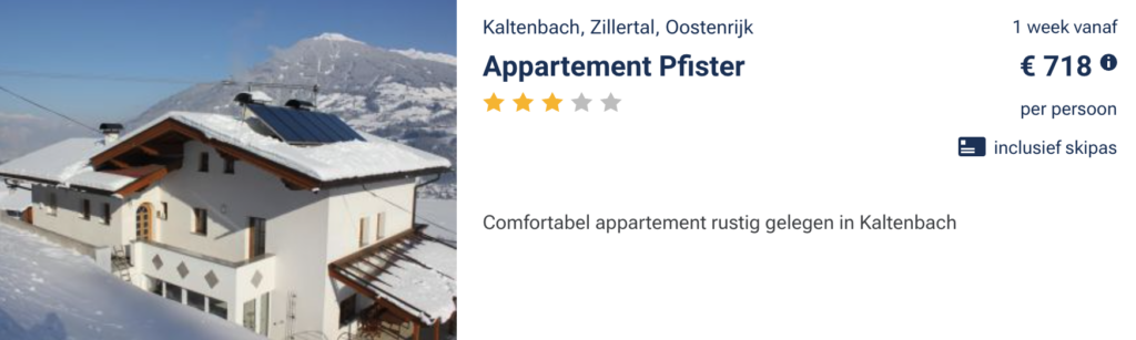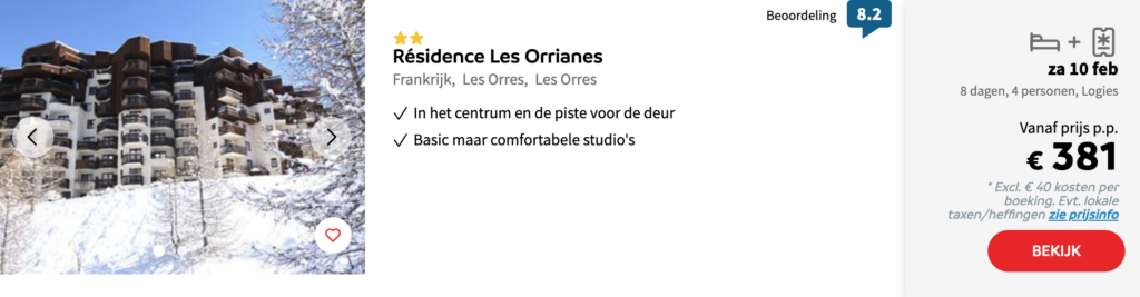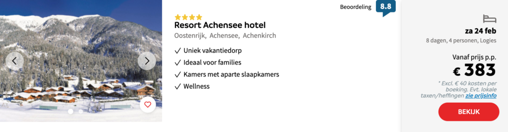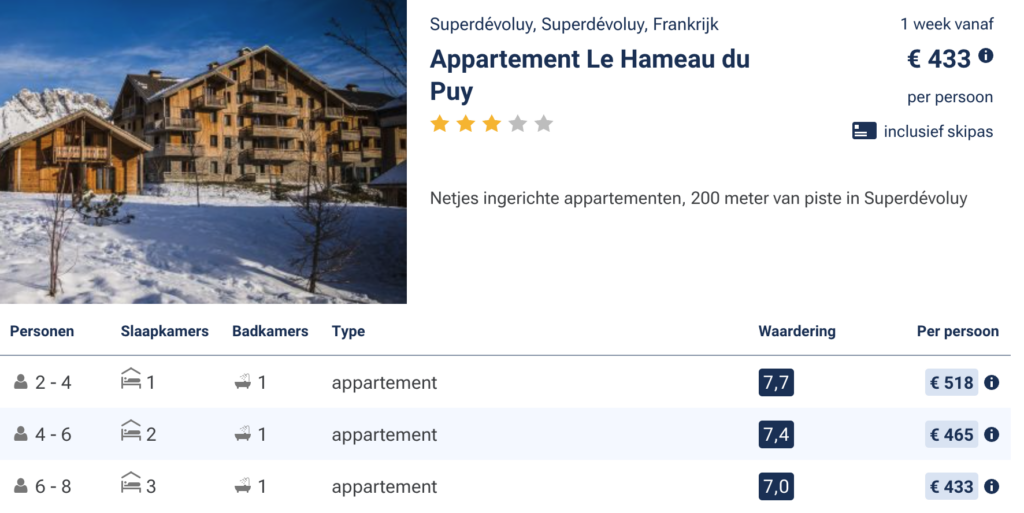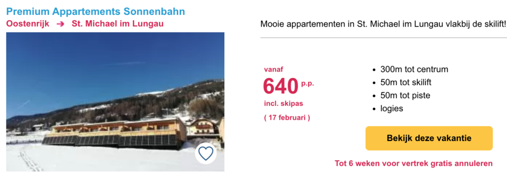 Het is gemakkelijk om te denken dat een wintersportvakantie in de voorjaarsvakantie veel geld kost vanwege de drukte. Maar dit hoeft helemaal niet duur te zijn. Hieronder hebben we een aantal goede aanbiedingen voor je verzameld. Het betreft 8-daagse wintersportvakanties inclusief skipas. Klik op de afbeelding voor meer informatie, prijzen en om te boeken.