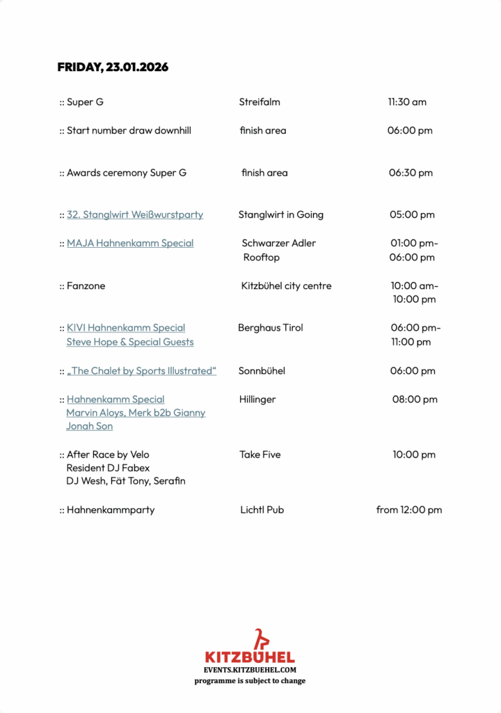 Morgen is het dan zover! Met een afdaling, super-G en een slalom op het programma voor de mannen tijdens de Hahnenkamm-Rennen 2026 in Kitzbühel zal het, net als elk jaar, een spannend event worden. Vanaf volgende week kun je je agenda leegmaken, want er staat elke dag van de week wel iets op het programma. Ga jij kijken via Eurosport?