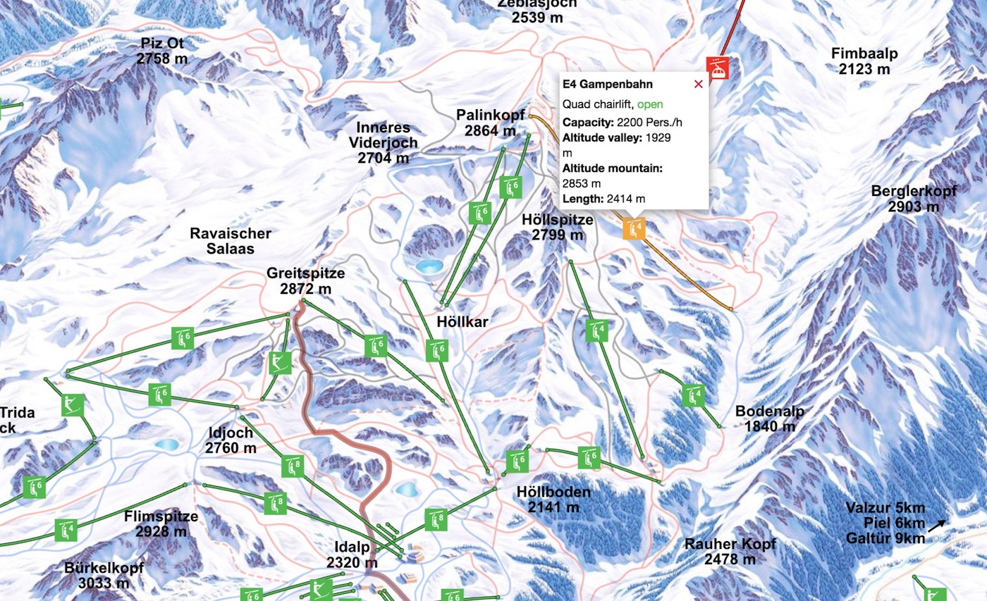 Het dalstation van de Gampenbahn bevindt zich rechts van de Fimabach op 1924 meter hoogte. Het instappunt van de nieuwe lift zal zich 30 meter lager bevinden dan nu het geval is. Het huidige dalstation en bergstation worden compleet afgebroken. Het bergstation van de lift komt op 2.848 meter hoogte te liggen, ongeveer 130 meter ten zuiden van de vorige zomer vernieuwde Palinkopfbahn.
