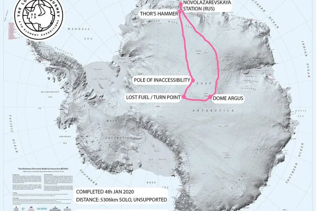 De Australiër vertrok op 9 november vanuit Thor’s Hammer aan de Antarctische kust. De reis bracht hem eerst naar het verste punt landinwaarts. Vervolgens naar het hoogste punt, Dome Argus. Dit ligt niet alleen op een hoogte van 4000 meter. Maar is ook één van de koudste plekken op aarde. Het kan hier wel -70° Celsius worden! Uiteindelijk ging de reis terug via Thor’s Hammer naar de Russische Novolazarevskaya-basis aan de kust.