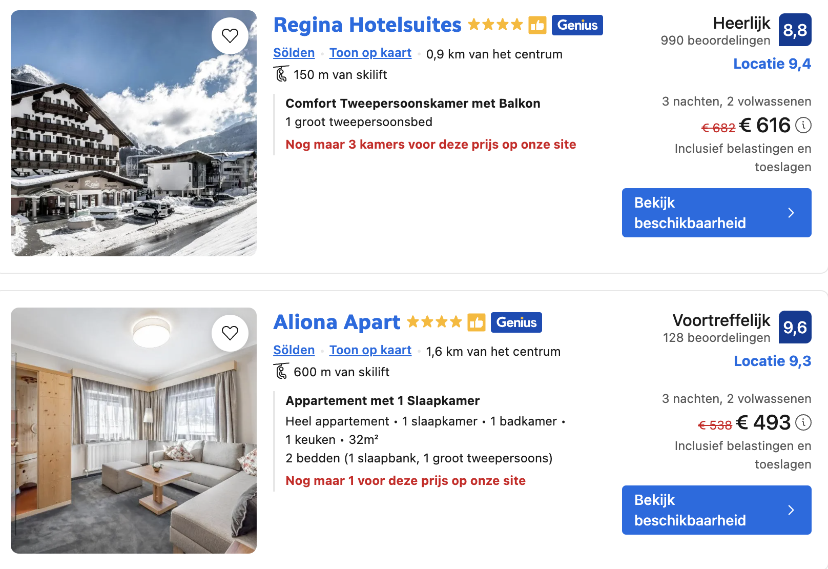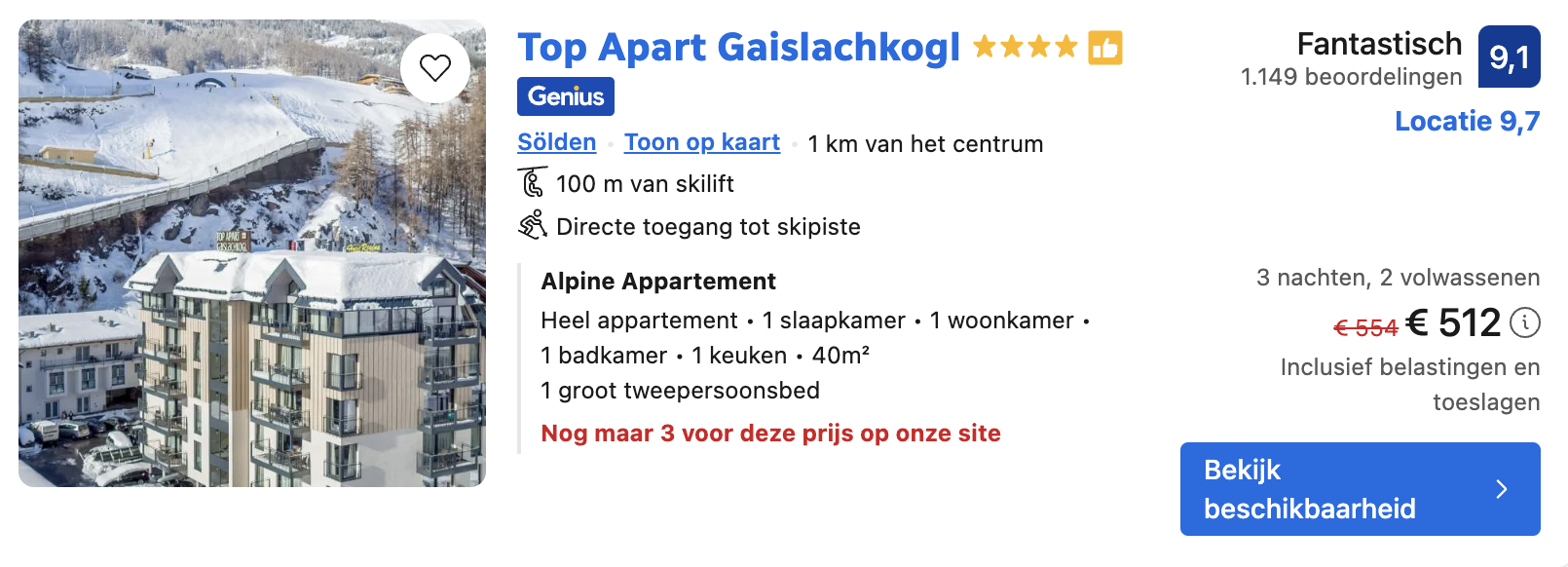 Heb je dit weekend nog niks op de planning? Dan hebben wij een aanrader! Je kunt nu nog last-minute boeken voor dit weekend naar Sölden. Dan kun je dit weekend nog afdalen op verse sneeuw en de nieuwste wintersportgear testen. Bekijk de volgende deals van Booking.com: