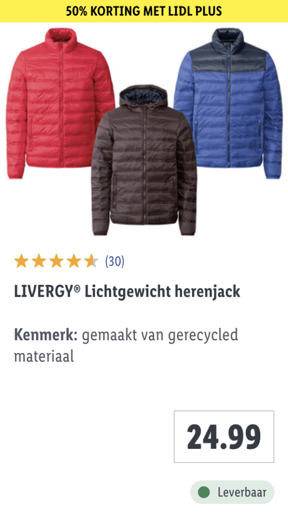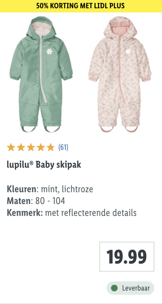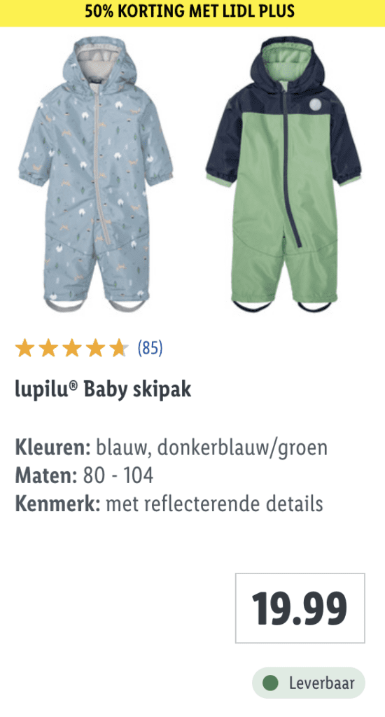 Op veel artikelen is er op dit moment 50% korting met Lidl Plus. In de app van Lidl vind je je persoonlijke kortingscode na aanmelden. Super simpel en snel geregeld! Interessant voor als je nog op zoek bent naar bijvoorbeeld een nieuw baby skipak, thermo-ondergoed of sneeuwschoenen voor de kids. Het aanbod is niet heel uitgebreid, zeker niet het beste van het beste, maar wel zeer betaalbaar. Op deze manier schaf je snel en voordelig nieuwe wintersportkleding aan. Er is keuze uit verschillende modellen, kleuren en types skikleding. Neem snel een kijkje! Misschien zit er ook voor jou iets tussen.