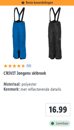De Lidl skikleding is vooral interessant voor kinderen die jaarlijks uit hun wintersportoutfit groeien. Op deze manier kun je snel en voordelig nieuwe winterkleding voor ze aanschaffen. Er zijn verschillende modellen, kleuren en soorten skikleding beschikbaar bij Lidl, dus er is voor elk wat wils. Maar, Lidl biedt niet alleen skikleding voor de wintersport. Ze hebben ook skihelmen en handschoenen in het assortiment. Neem snel een kijkje! Wellicht vind je hier ook iets dat bij jou past.