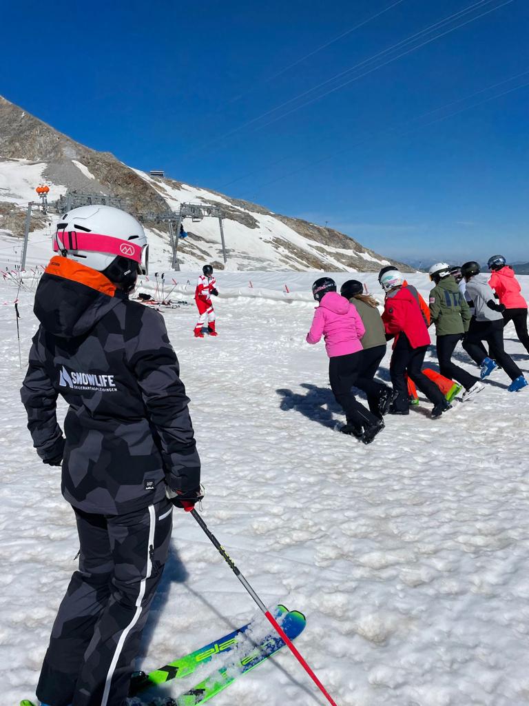 De hele week wordt er hard getraind op de Oostenrijkse gletsjer door deelnemers van Snowlife Skilerarenopleidingen. De wintersporters hopen na deze training hun eerste diploma te halen om skileraar te worden. De training bestaat grotendeels uit skiën, maar er moet ook theorie geleerd worden. Naast al het skiën is er natuurlijk ook tijd om te relaxen. Zo kun je nu in Oostenrijk bijvoorbeeld zwemmen in de meren en met temperaturen rond de 30 graden in het dal, is dat een heerlijke beloning na het wintersporten op de gletsjer. Marleen: “De deelnemers ervaren het als een week vol leermomenten. Het is zwaar qua doorzettingsvermogen, maar er zijn ook momenten waar er veel gelachen wordt.”