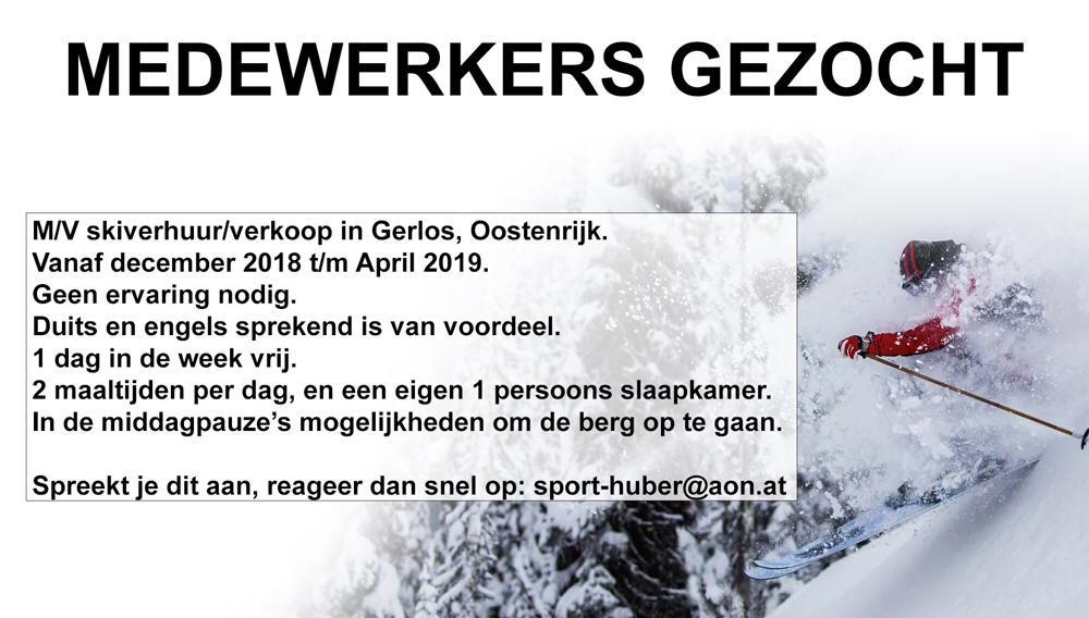 Voor het komende winterseizoen 2018-2019 zoekt Sport Huber in Gerlos nog medewerkers voor in de skiverhuur/verkoop. Met drie filialen in het dorp, waarvan twee direct bij de liften, is het de grootste skiwinkel/skiverhuur in Gerlos.