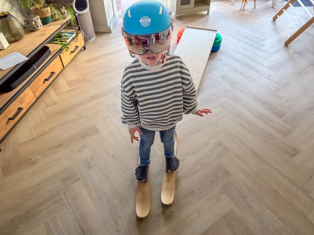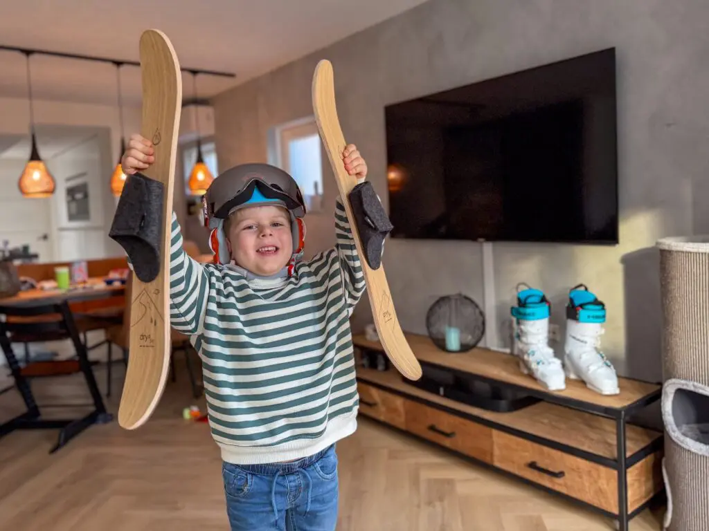 Met deze houten ski’s leren je kinderen thuis skiën in de woonkamer