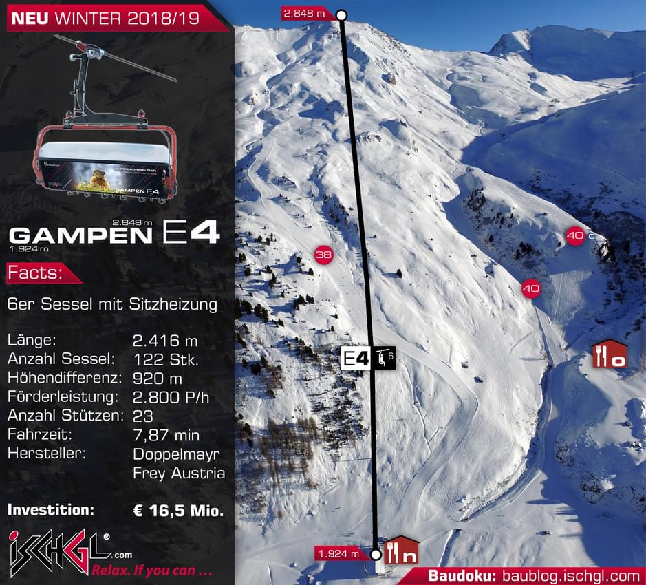 Van de toegangspoortjes tot de stoelbekleding, alles is opnieuw ontworpen voor de nieuwe Gampenbahn. Met een hoogteverschil van 924 meter neemt de Gampen E4 een recordpositie in met het grootste hoogteverschil wereldwijd. Het hoge passagierscomfort en het minimale geluid dat de stoeltjeslift produceert, maakt de nieuwe Gambenbahn een eersteklas stoeltjeslift. Zo heeft de lift ergonomisch gevormde stoelen, zitplaatsen van 52 centimeter breed met stoelverwarming en een geoptimaliseerd veiligheidsontwerp. Achterop de stoeltjes vind je dit keer niet de gezichten van wereldsterren als Helene Fischer, maar van de sterren van het gebied. Dat zijn de dieren dier er leven. Elk stoeltje heeft een andere achterkant, dus er is altijd wat nieuws te zien.