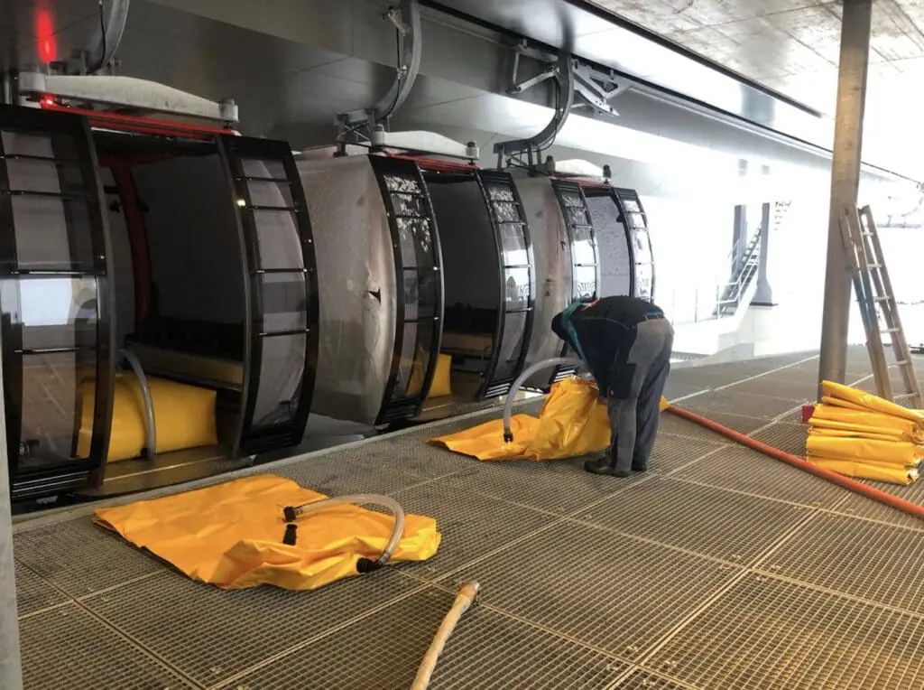 Op dit moment worden er fictieve passagiers, in de vorm van waterzakken, in de gondels van de Zwölferkogelbahn geladen. Dat laat Tanja Heugenhauser van de liftmaatschappij weten. Die waterzakken zorgen voor gewicht, waarmee de remmen van de lift kunnen worden getest. Het is immers wel fijn als er geen echte mensen inzitten als de remmen het niet naar behoren blijken te doen. Op de onderstaande foto zie je dat de waterzakken worden gevuld en in de lift worden geplaatst.