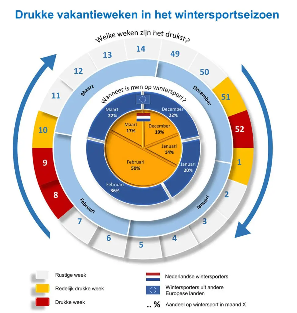 Als ook andere Europese landen worden meegenomen, komt uit het onderzoek dat week 52, 8 en 9 het drukste zijn. Dit zijn voor ons Nederlanders de kerstvakantie en voorjaarsvakantie. Het zijn niet alleen wij die dan vakantie hebben, maar ook andere landen. In februari staat 36% van de skiënde Europeanen op de piste. In december is dit 22%.