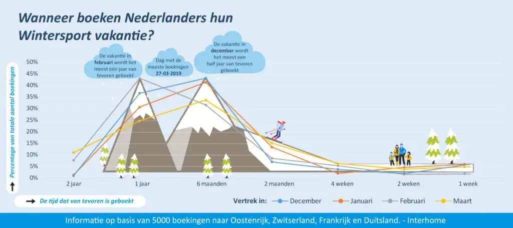 Wanneer boekt Nederland nou de wintersport? Opvallend is dat er een duidelijk verschil zichtbaar is tussen Nederlanders die in de kerstvakantie op wintersport gaan en Nederlanders die in de voorjaarsvakantie richting de Alpen trekken. De voorjaarsvakantie wordt meestal een jaar van tevoren geboekt. Terwijl de kerstvakantie ongeveer een half jaar van tevoren wordt geboekt. In maart worden de meeste boekingen gedaan. Dit zijn dan de boekingen voor de voorjaarsvakantie van het jaar erop.