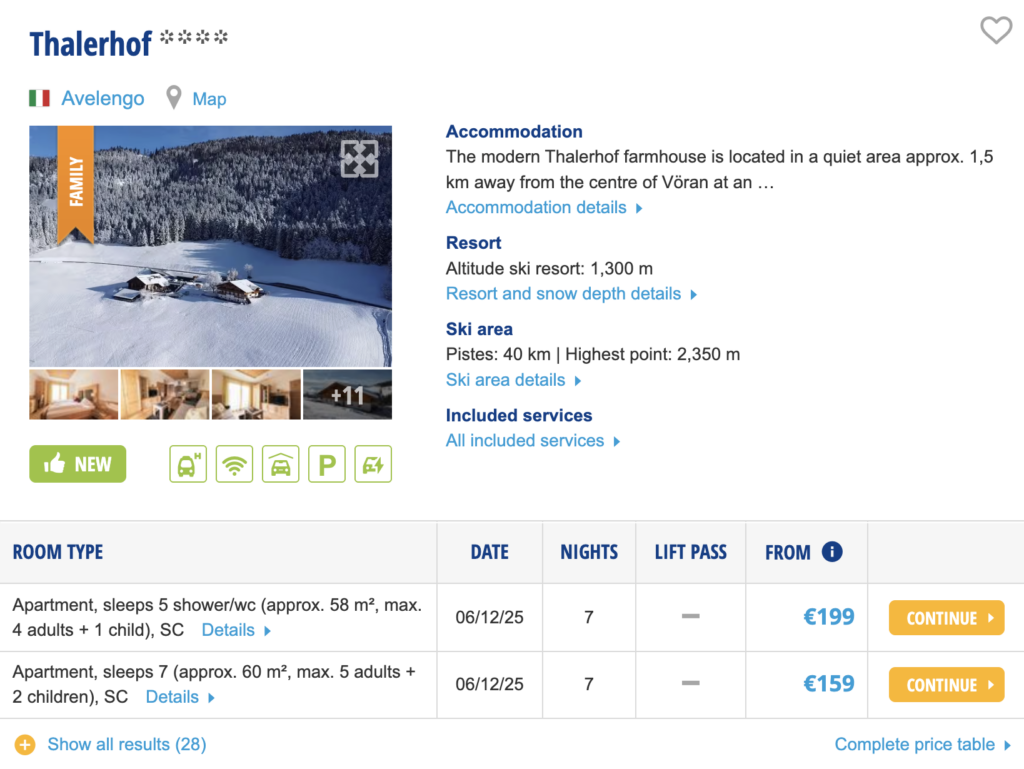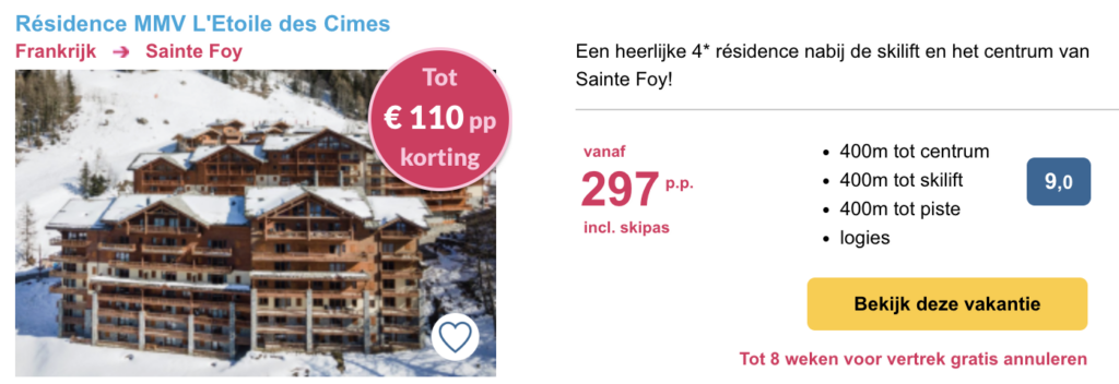 Bij Snowtrex zijn er ook verschillende aanbiedingen onder de € 300,-. Verschillende opties in verschillende landen, allemaal inclusief skipas. Dat heb je in ieder geval alvast geregeld! Deze deals zijn allemaal voor 7 nachten en in seizoen 2025/2026.
